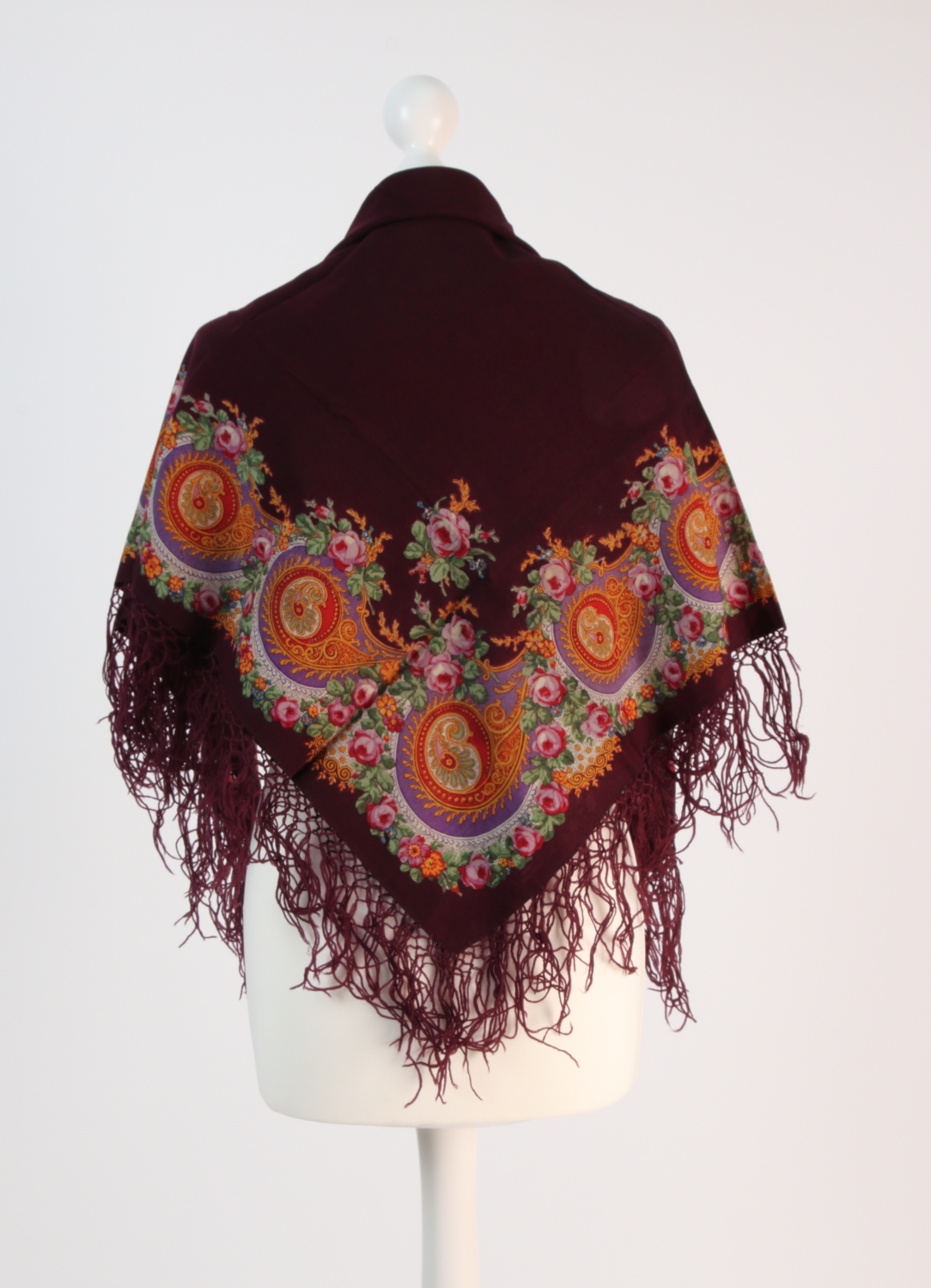 Dunkelviolettes Tuch mit bunter Bordüre in Rot/Gelb/Violett/Weiß, mit Rosen und Paisley-Motiven. Abgesteppte Schnittkanten mit geknüpften Fransen.