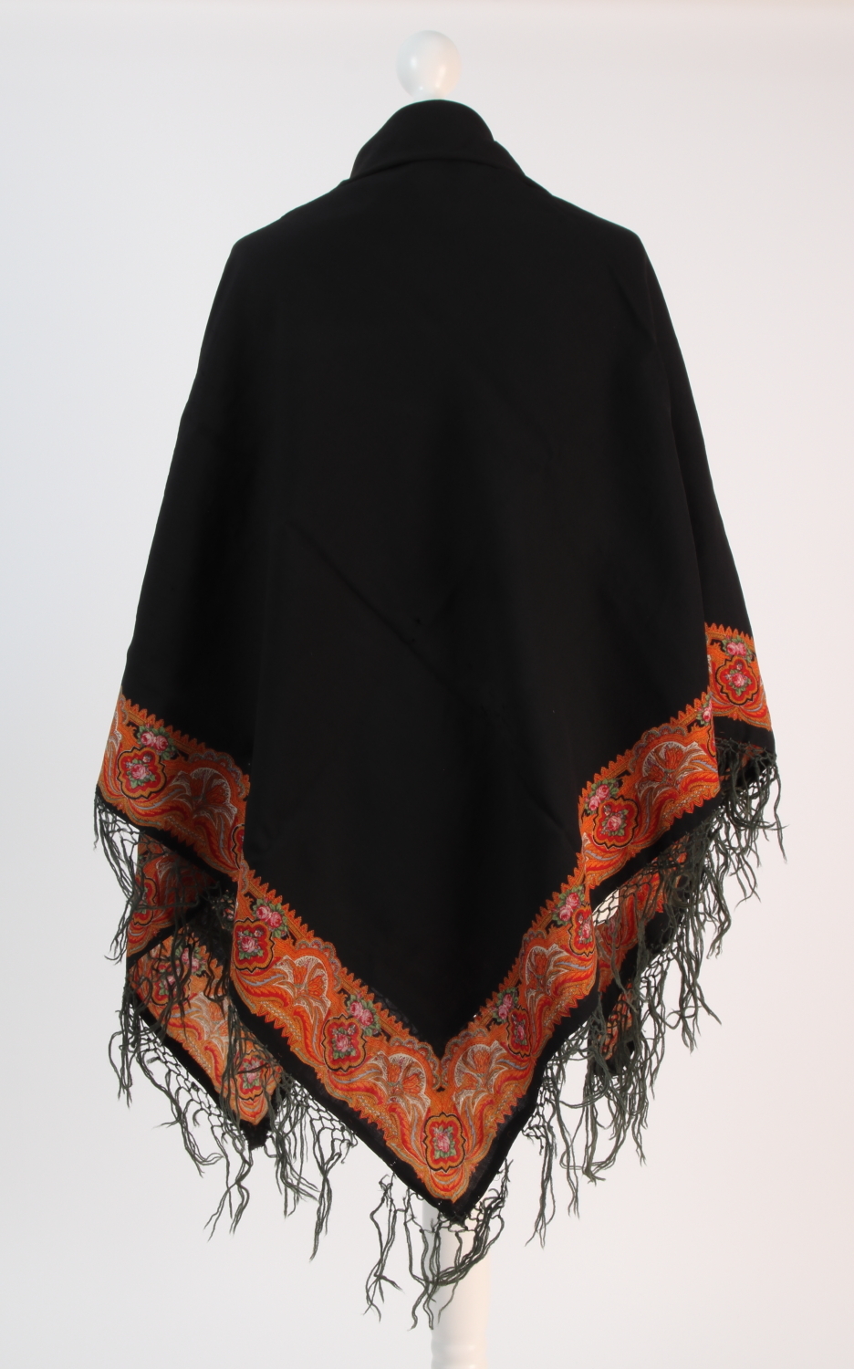 Schwarzes Tuch mit umlaufender floral-ornamentaler Bordüre und zwei Eckelementen mit Rosen in Rot/Rosa/Orange/Grün/Hellblau. Geheftete Schnittkanten und grüne, geknüpfte Fransen.