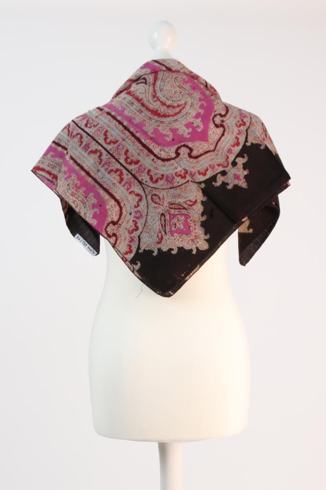 Dunkelbraunes Tuch mit Paisleymuster in Rot/Violett/Hellblau/Grün auf violettem Grund. Wurde aus einem größeren Tuch oder Schal geschnitten, versäuberte Kanten.
