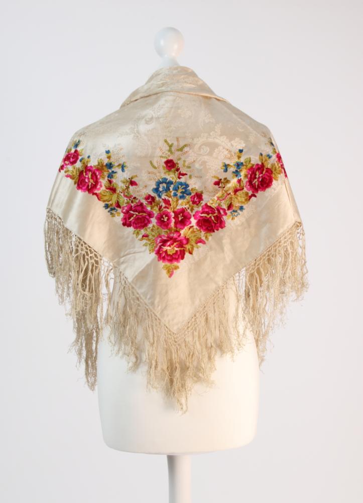 Tuch in Ecru mit floral-ornamentalem Muster und einer umlaufenden Rosen-/Blumenbordüre in Rosa/Blau/Grün. Zwei Webe-, zwei abgesteppte Kanten mit geknüpften Fransen.