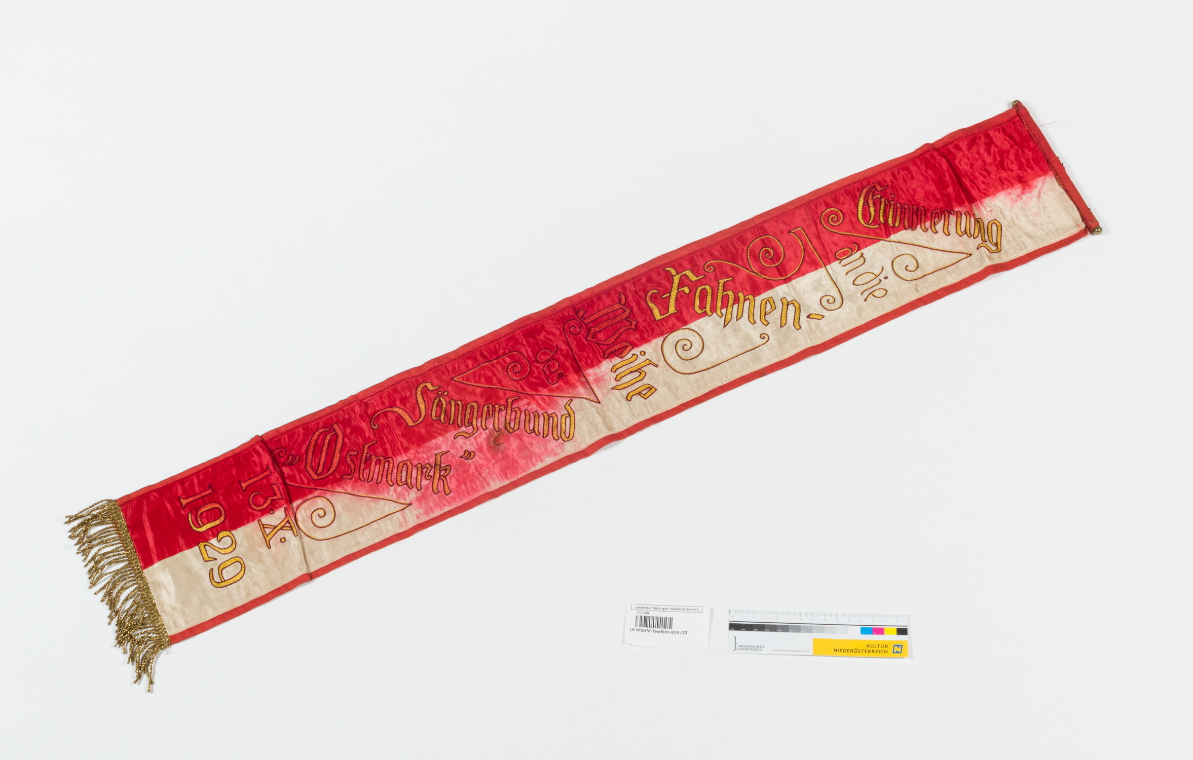 Schriftzug: Erinnerung an die Fahnenweihe des Sängerbund "Ostmark", 13.X.1929. Firmenstempel: Karl Timper´s Wtw. Kunst- Werkstätte für Gold- u. Seidenstickerei, beeid. Schätzmeister u. Sachverständiger, Wien, VI. Hirschengasse 20, Telefon B 26-7-63.