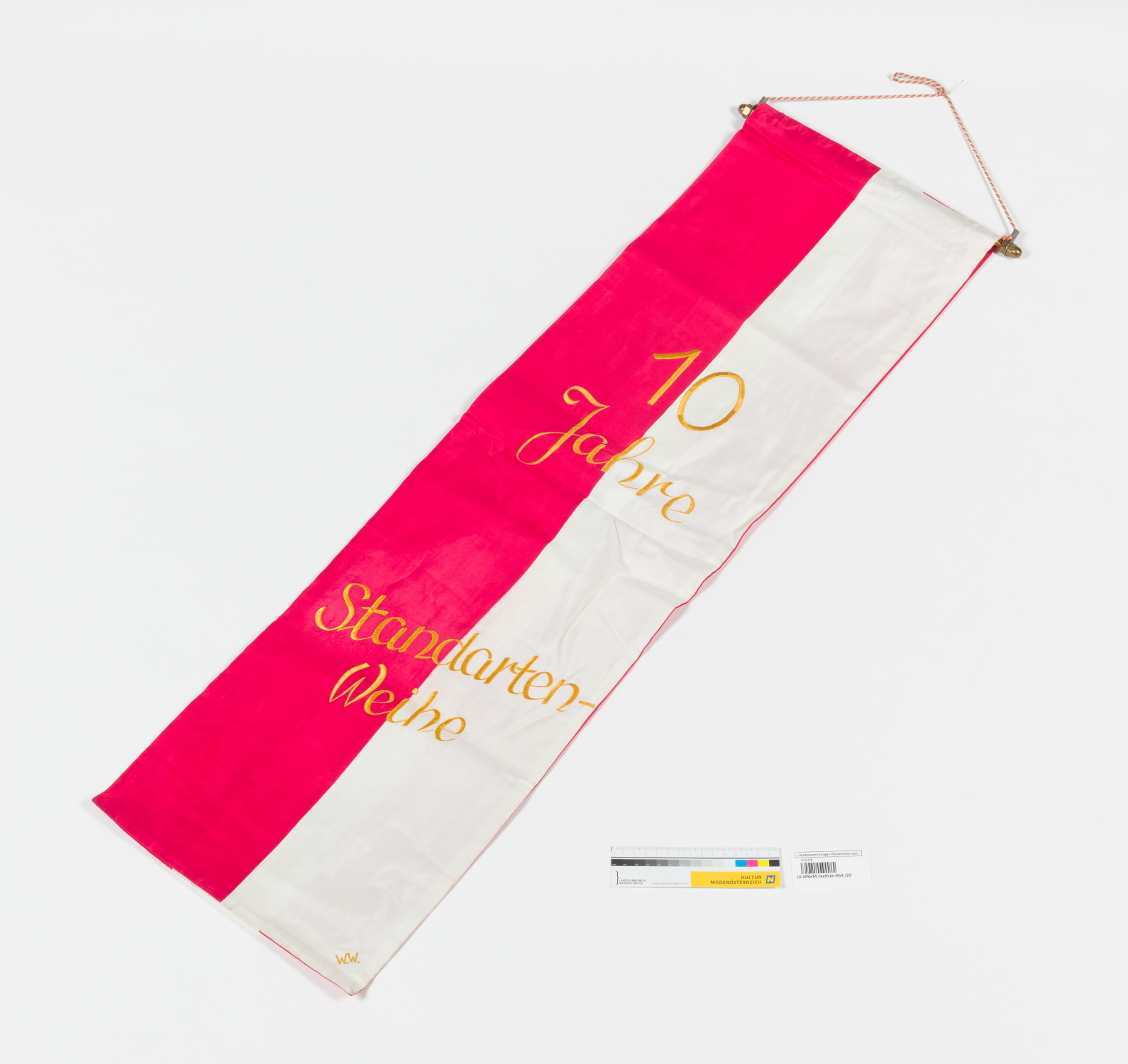 Rot/weißes Fahnenband mit Schriftzug und Monogramm "W.W.", Rückseite Rot/Weiß/Rot gestreift, geschraubte Querstange mit rot/weißer Kordel zum Anhängen.
