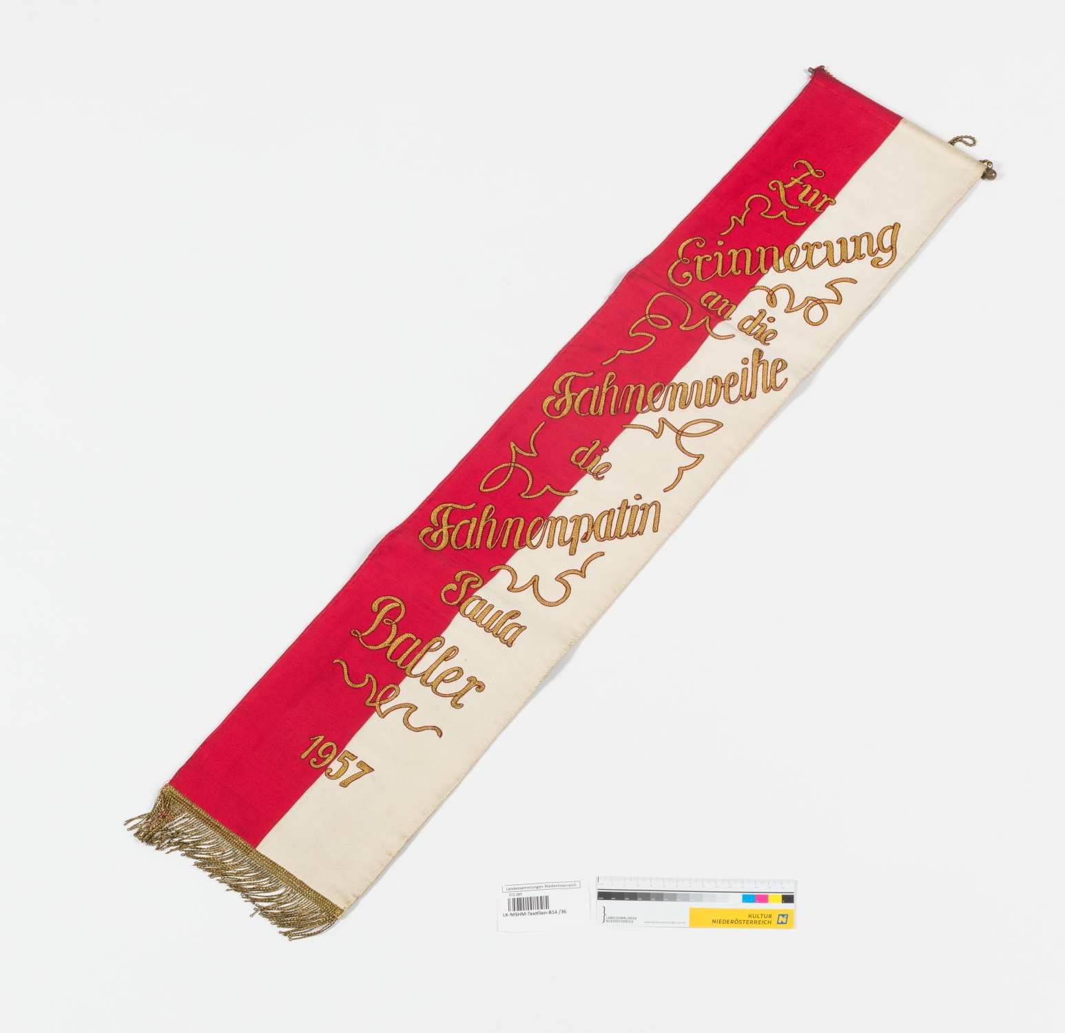 "Fahnenband aus rot/weißem Rips-Band mit gesticktem Schriftzug in Schnurstickerei, Unterkante mit goldener Fransenborte besetzt. Rückseite Schwarz/Rot/Schwarz quer gestreift mit drei Troppauer Ansichten in Postkartenformat, mit Schutzfolie aufgenäht, geschraubte Querstange mit Kugelkette.