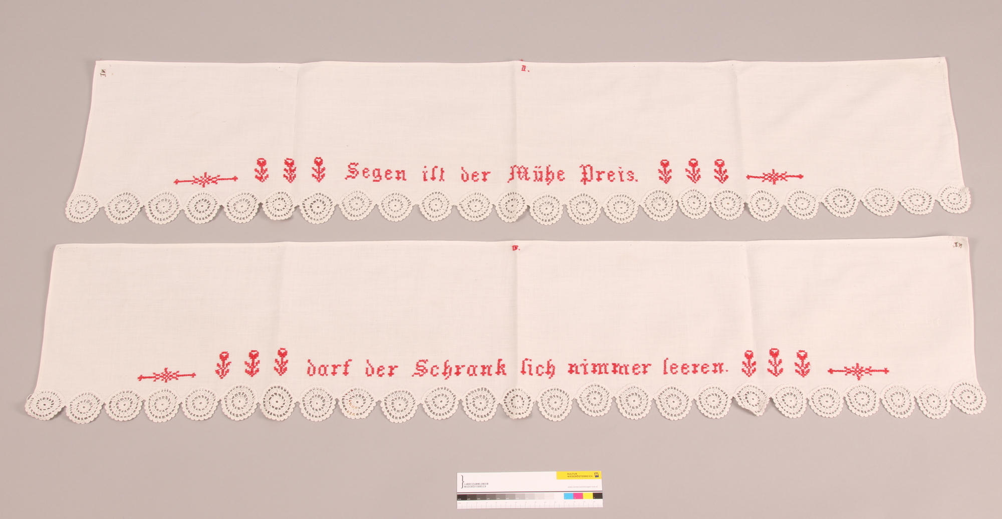 Weißer Kastenstreifen mit Spruch und Blumen in roter Kreuzstichstickerei, Unterkante mit Häkelspitze (Rosetten) eingefaßt (Teil 2, Teil 1 und 3 fehlen).