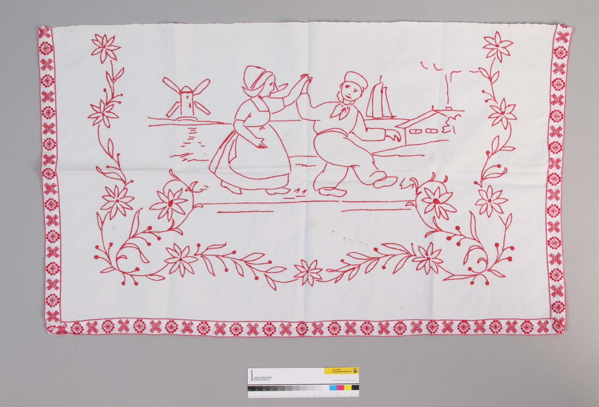 Rote Stielstichstickerei auf weißem Grund, an drei Seiten mit einer rot/weißen Borte eingefaßt, Webekante an der Oberseite. Holländisches Pärchen mit Windmühle, Segelboot, Haus und Blumenranken.