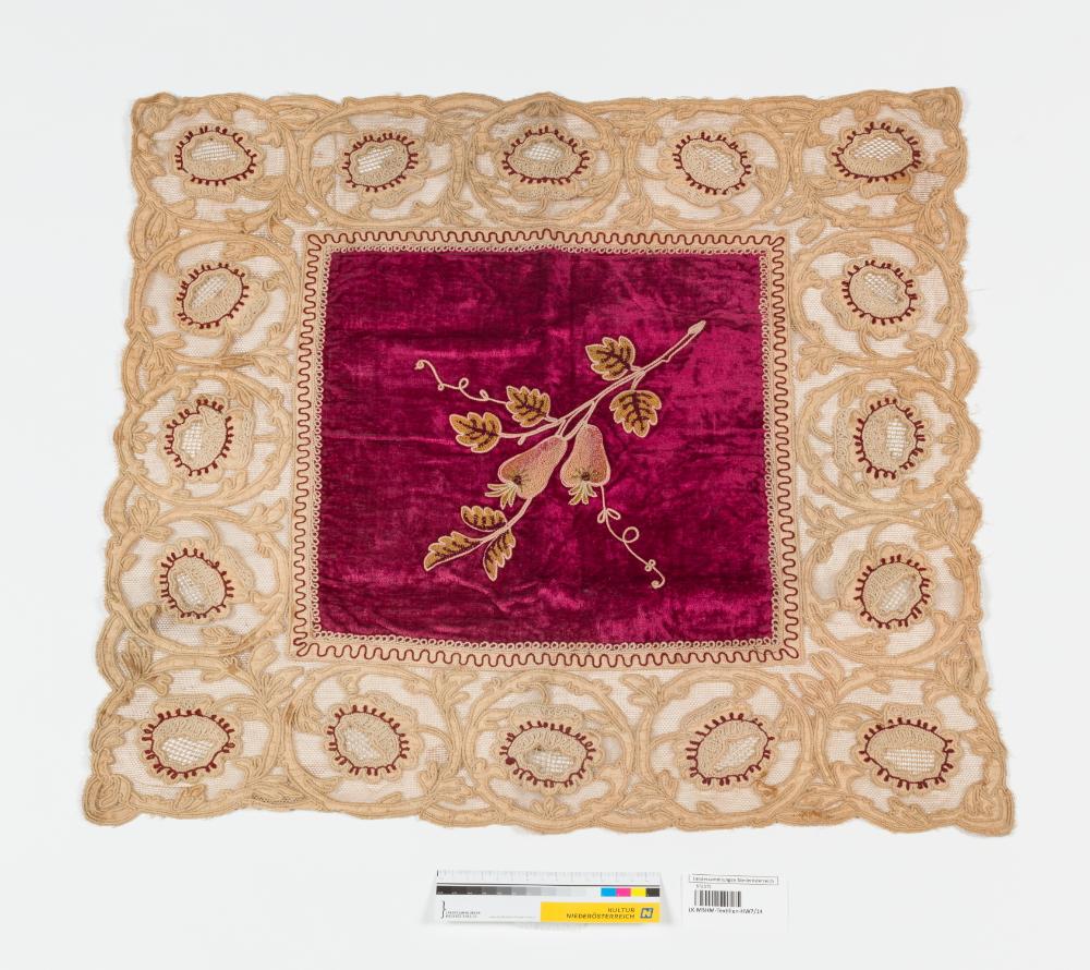 Weinroter Samt mit Birnenzweigen in Schnurstickerei, umlaufend mit Tüllspitze in Ecru mit Applikations-/Schnurstickerei besetzt, Akzente in weinroter Tambourierstickerei.