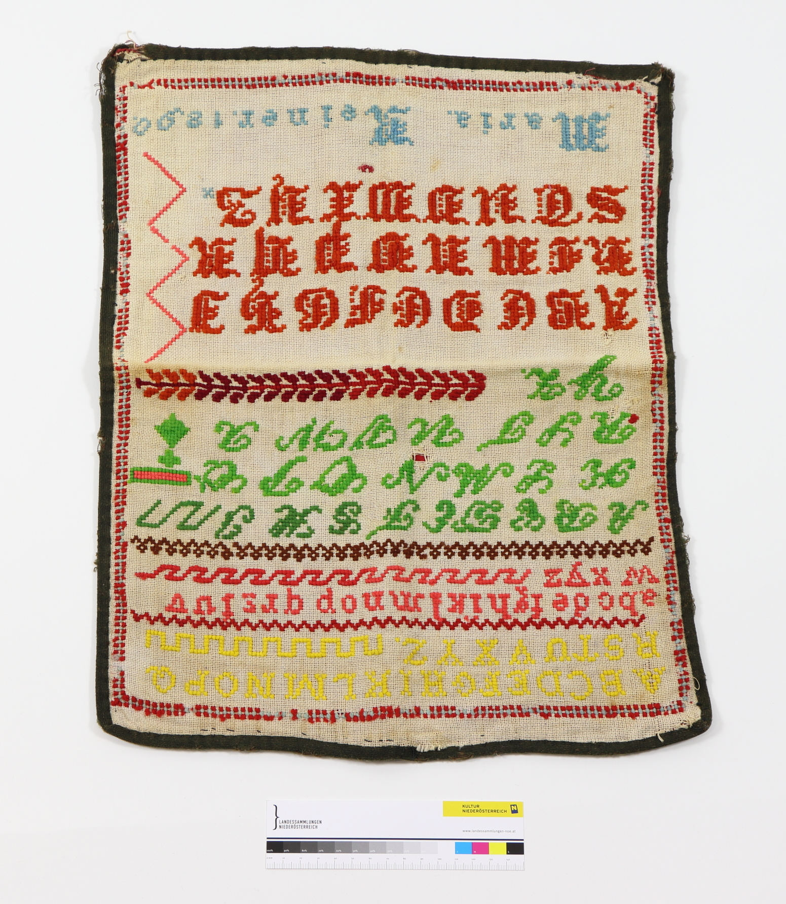 Naturfarbenes Stickmustertuch mit Alphabet in Rot, Grün, Gelb in Kreuzstichstickerei. Mit brauner Borte eingefaßt, Rot hinterfüttert, Schriftzug " Maria. Reiner.1890".