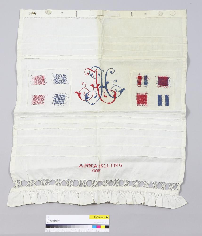 Weißes Stickmustertuch mit Säumchen, Knopf- und Knopflochleiste, Durchbruchstickerei, teilweise in Rot/Blau bestickt, Monogramm "AH" in Reliefstickerei, Schriftzug "Anna Heiling1893" in Kreuzstichstickerei.