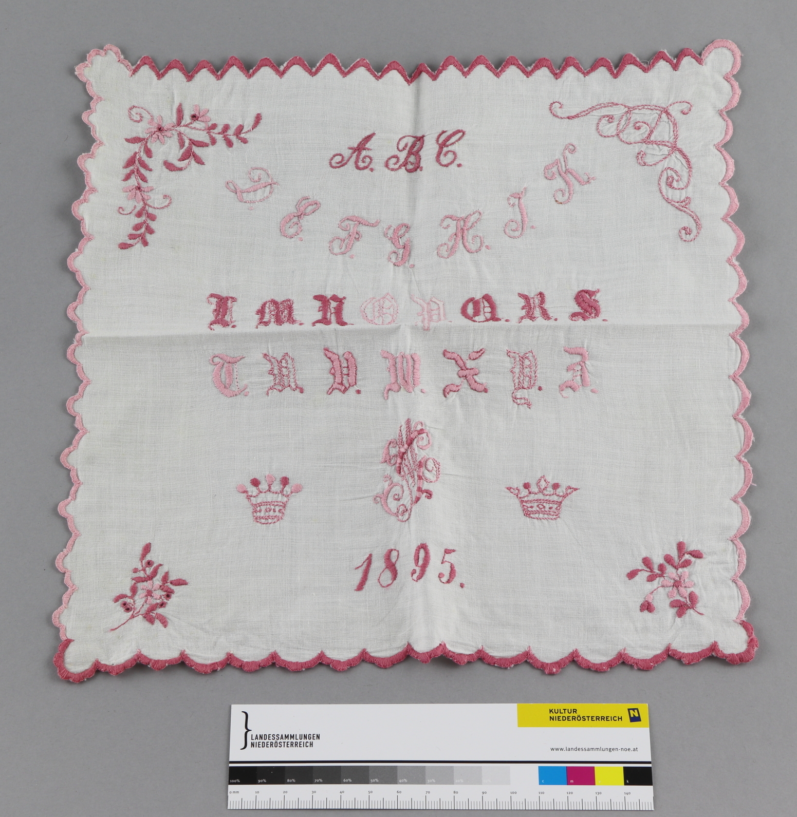 Weißes Stickmustertuch mit Alphabet, Kronen und Eckornamenten in rosa Reliefstickerei, geschlungene Kanten, Monogramm "GM".