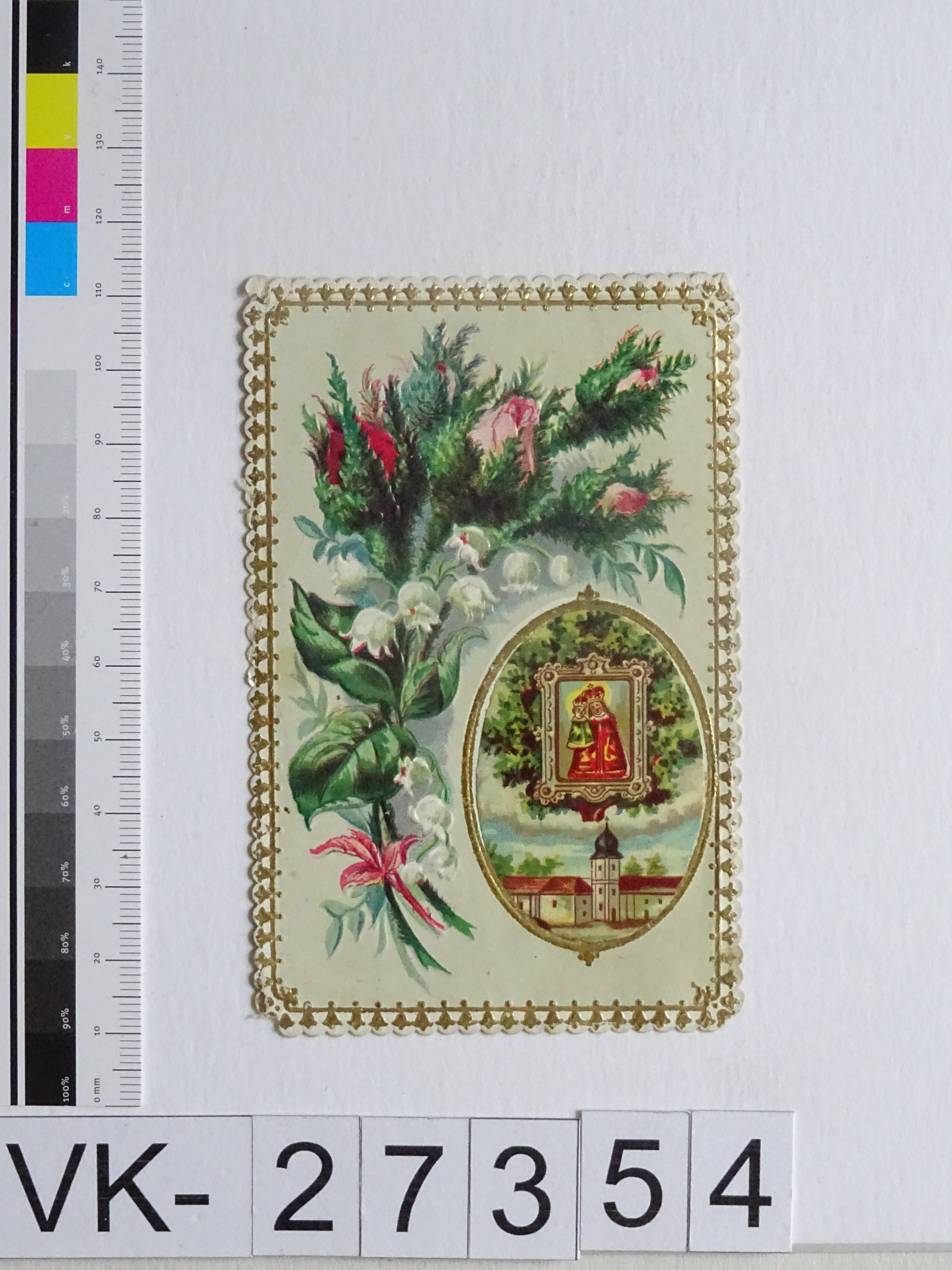 Mariahilfberg bei Gutenstein; Vorderseite: Gnadenbild = Maria mit Kind, Wallfahrtskirche, Blumen (Rosen, Maiglöckchen); Rückseite: Gebet