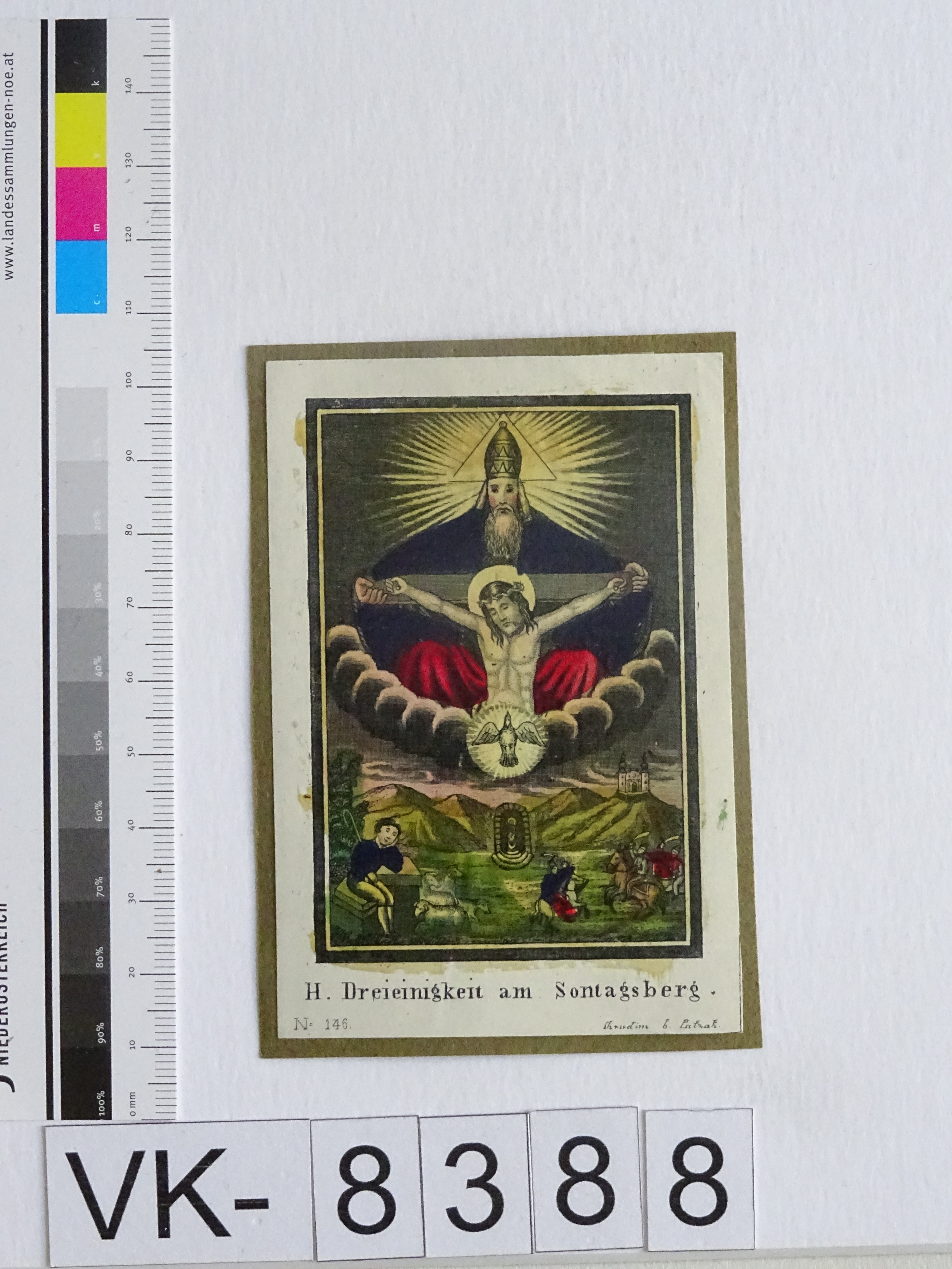 Sonntagberg; Vorderseite: Gnadenbild = Gnadenstuhl, Basilika, Hirte mit Schaf, Reiter, Maria von Lourdes, "Chrudim b. Patzak", "Nr. 146"; verklebt auf Karton; Eintrag Inventarbuch: "Kreuze; Doppelinventarisierung, auch auf Andachtsbildchen"