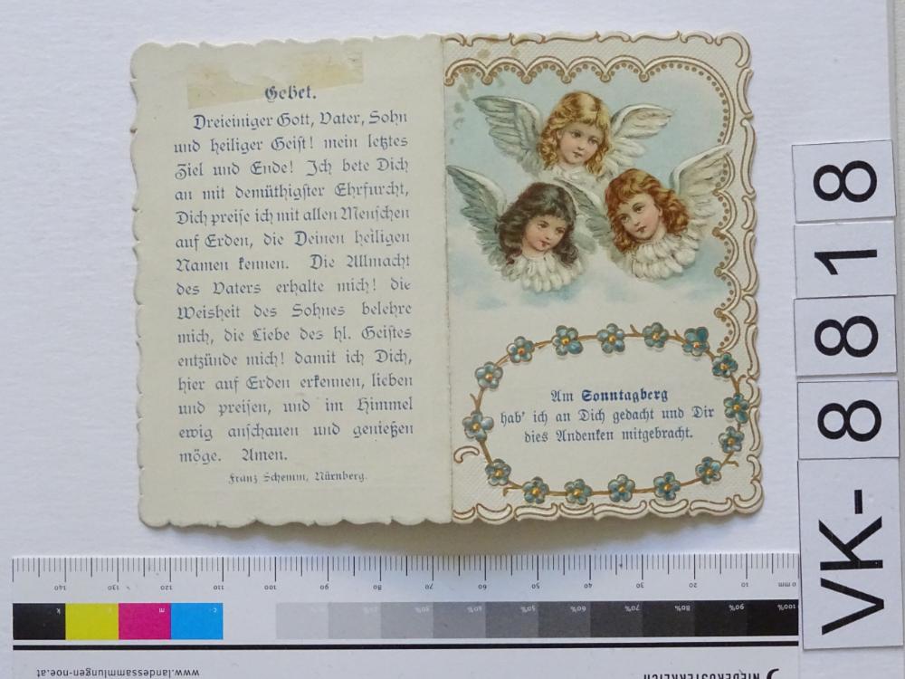 Sonntagberg; gefaltet; Vorderseite: Engel, Spruch, Blumen (Vergissmeinnicht); Innenseite: Spruch, Gnadenbild = Gnadenstuhl, Basilika; Rückseite: "Gebet", "Franz Schemm, Nürnberg"; Eintrag Inventarbuch: "Wallfahrtsbild, Sonntagberg"