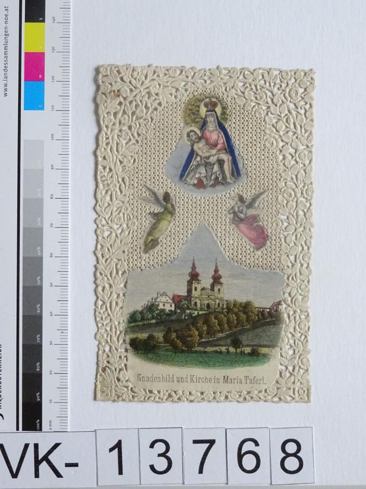 Maria Taferl; Vorderseite: Gnadenstatue = Pietà, Basilika, Engel; Rückseite: "Gebet zur Mutter Gottes von Maria Taferl", "Stich, Druck und Verlag von Franz Schemm, Nürnberg", monogrammiert "FW"