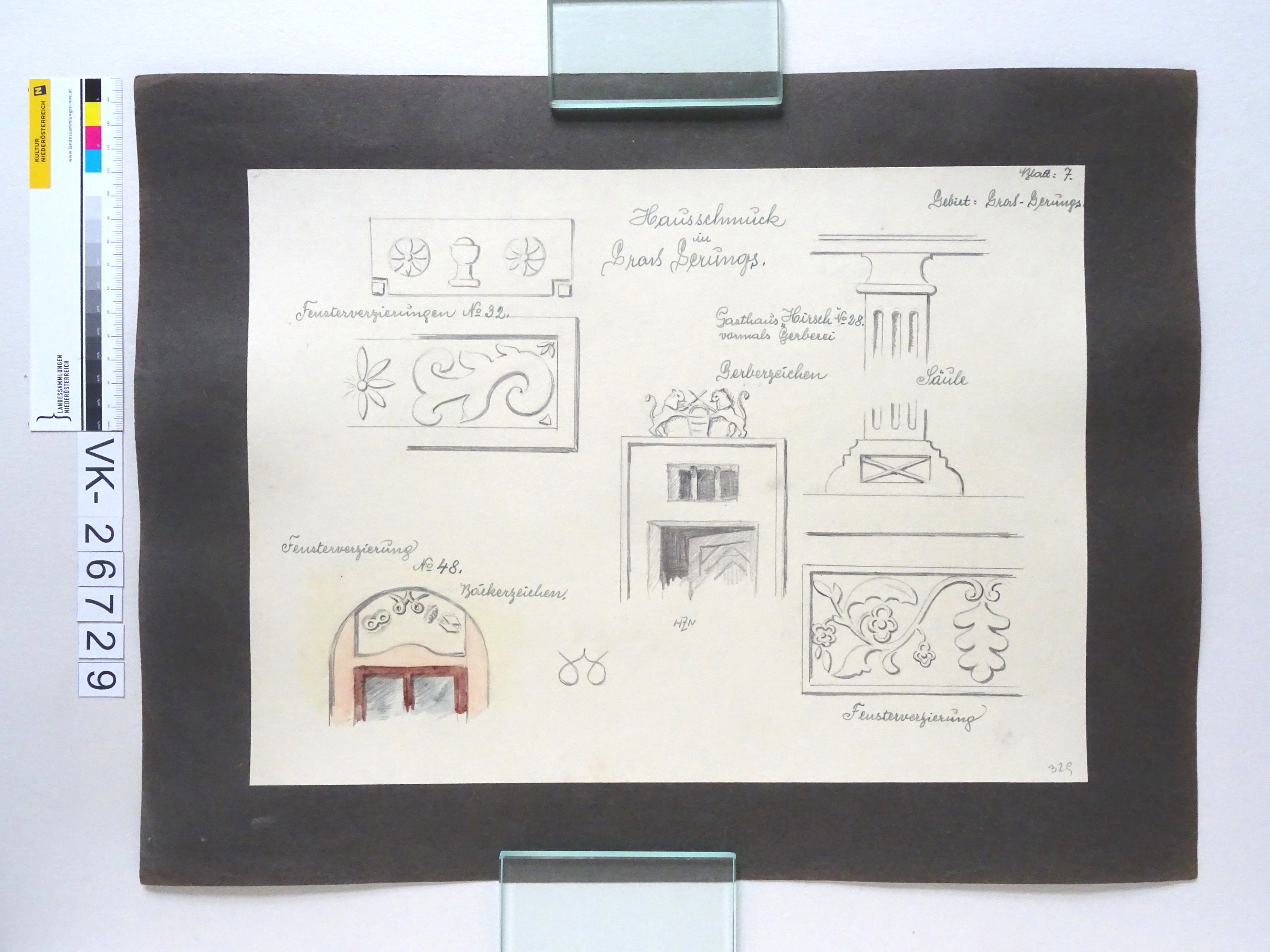 Zeichnung aus der Serie Waldviertler Heimatbilder: "Blatt 7: Gebiet Groß Gerungs, Hausschmuck in Groß Gerungs Nr. 28 Gasthaus "Hirsch" vormals Gerberei; Gerberzeichen, Säule, Fensterverzierung; Nr. 32 Fensterverzierungen; Nr. 48 Fensterverzierung, Bäckerzeichen; HZN"; Flachrelief, Zunftzeichen; signiert, kaschiert auf Karton; 329, 21/9