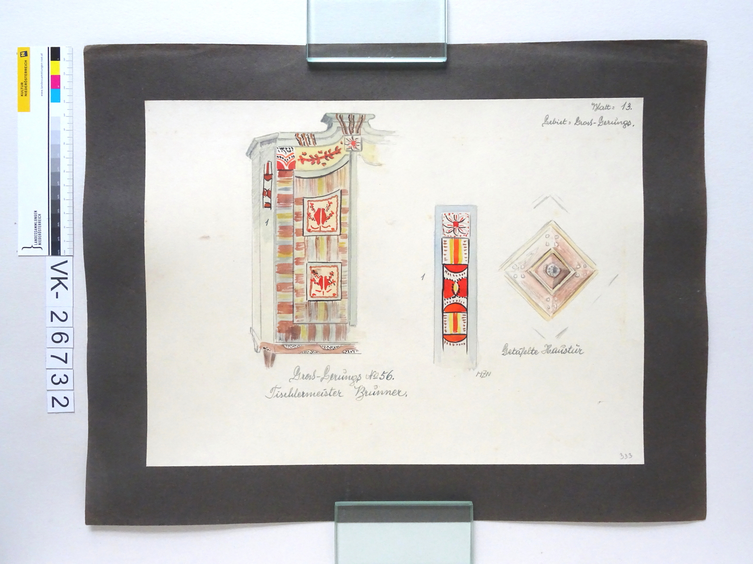 Zeichnung aus der Serie Waldviertler Heimatbilder: "Blatt 13; Gebiet Groß Gerungs, Groß Gerungs Nr. 56, Tischlermeister "Brunner", getäfelte Haustür; HZN"; Teilansicht eines bemalten Kastens; Krötenmotive; signiert; 333, 44/9