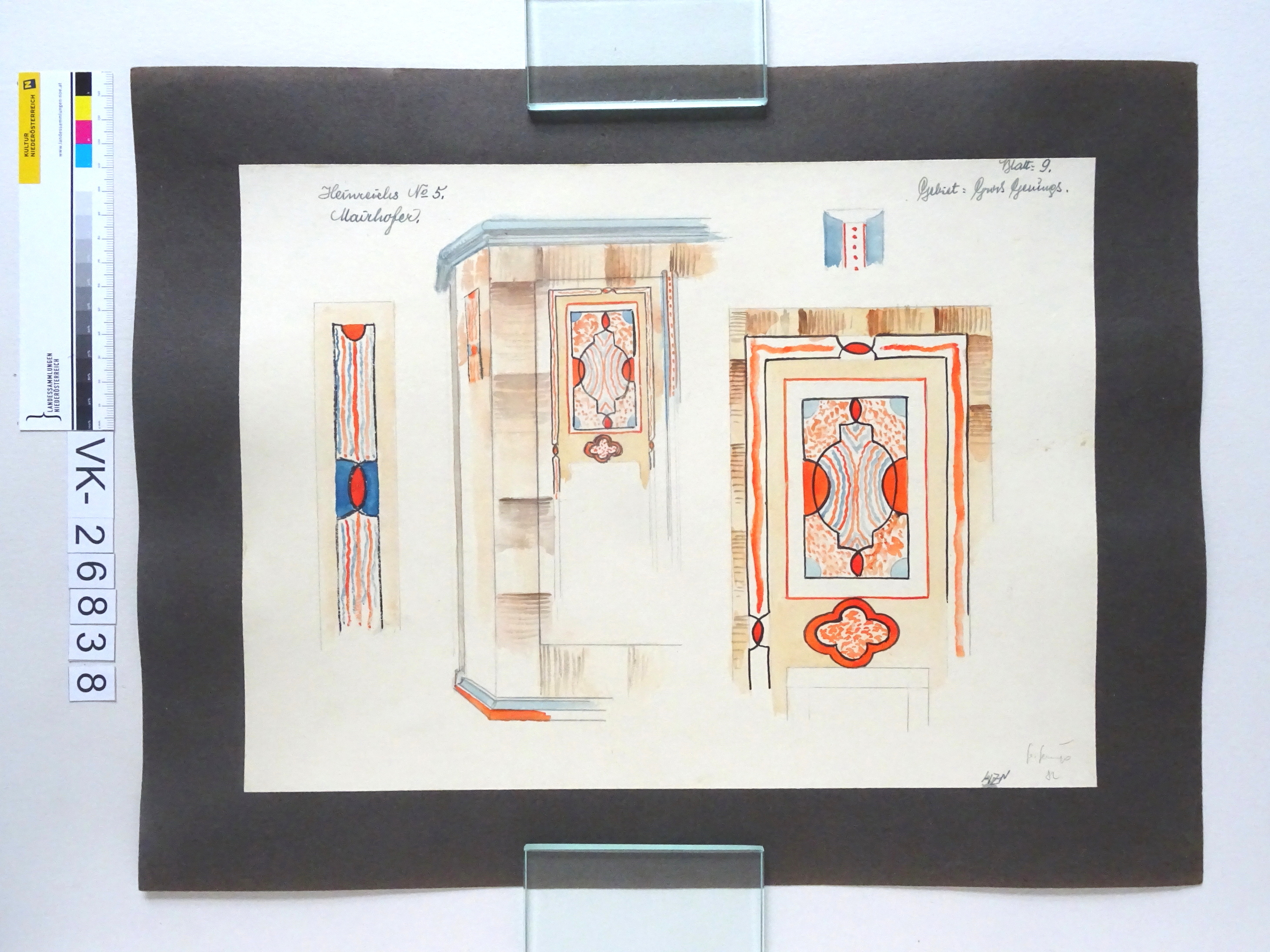 Zeichnung aus der Serie Waldviertler Heimatbilder: "Blatt 9: Gebiet Groß Gerungs; Heinreichs Nr. 5 "Mairhofer"; "HZN"; signiert, kaschiert auf Karton; Teilansicht eines bemalten Kasten; 82, 40/9