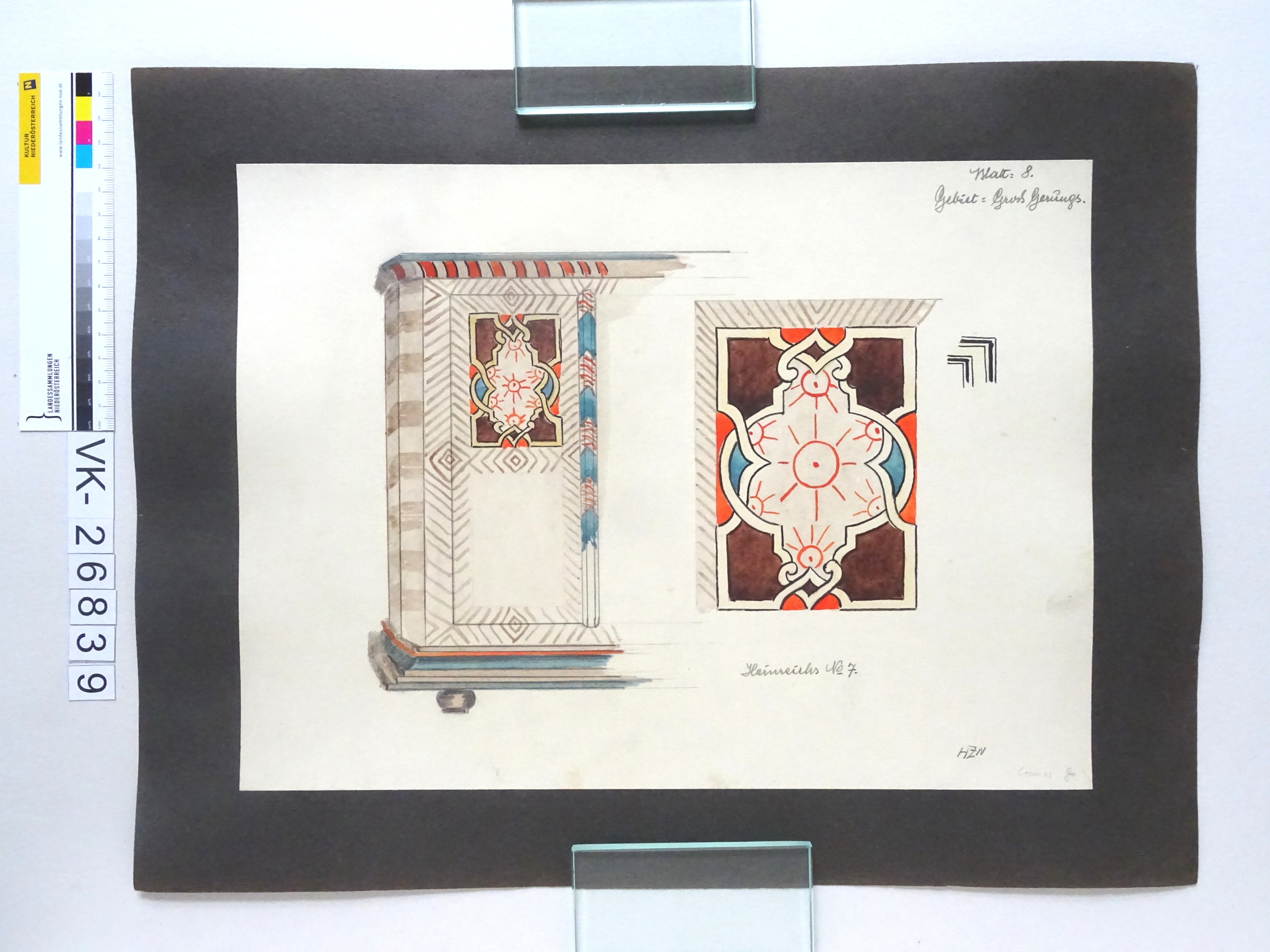 Zeichnung aus der Serie Waldviertler Heimatbilder: "Blatt 8: Gebiet Groß Gerungs; Heinreichs Nr. 7; "HZN"; signiert, kaschiert auf Karton; Teilansicht eines bemalten Kasten; 80, 41/9