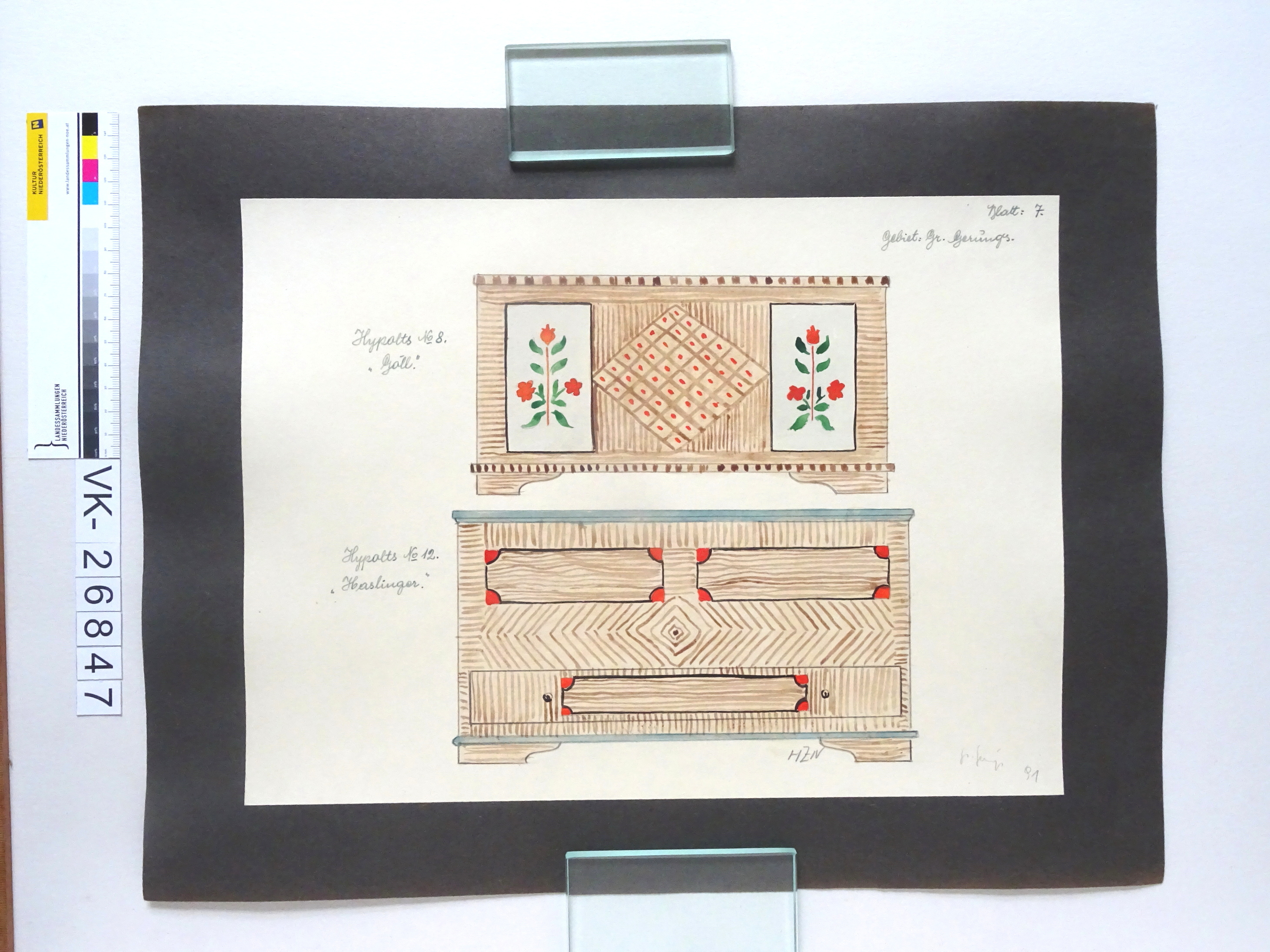 Zeichnung aus der Serie Waldviertler Heimatbilder: "Blatt 7: Gebiet Groß Gerungs; Hypolts Nr. 8 "Göll", Hypolts Nr. 12 "Haslinger"; HZN"; signiert, kaschiert auf Karton; bemalte Truhe (Dreisproß); 91, 58/9