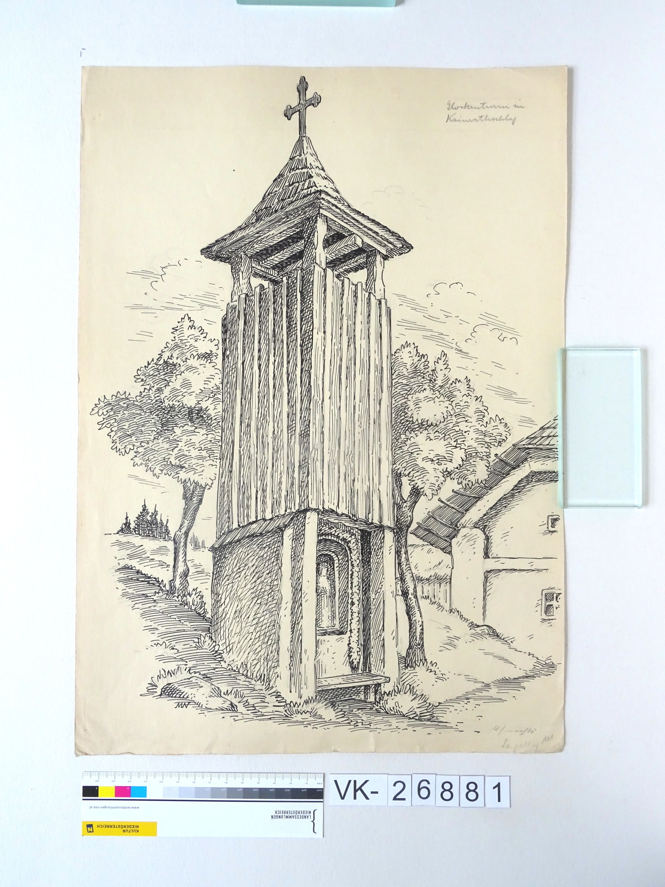 Zeichnung aus der Serie Waldviertler Heimatbilder: "Kainrathschlag: Glockenturm; MN"; signiert; Langschlag; Marterl, Heiligenfigur, Bankerl; 111, 4/rechts