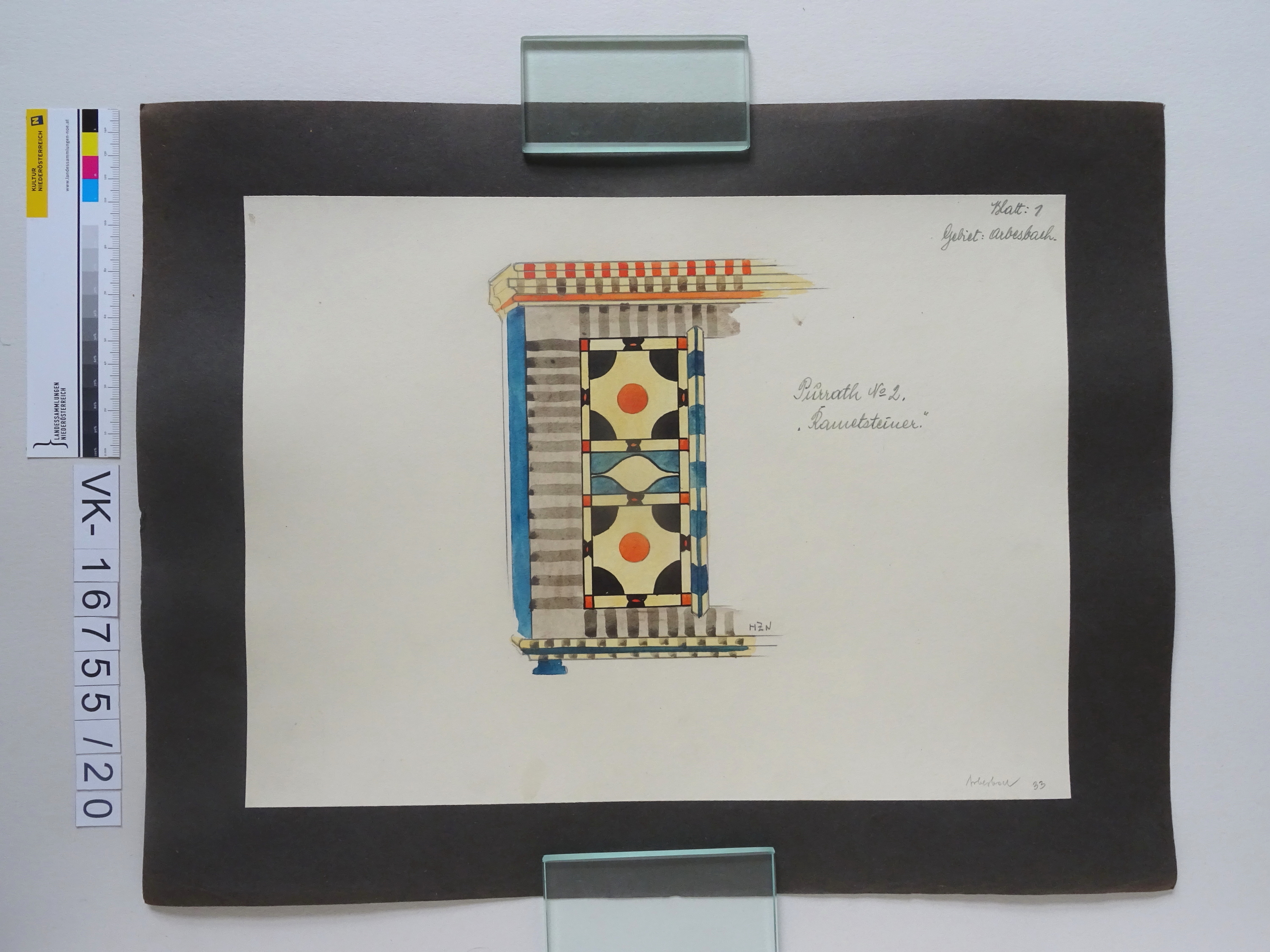 Zeichnung aus der Serie Waldviertler Heimatbilder: "Blatt 1: Gebiet Arbesbach, Purrath Nr. 2 "Rametsteiner", HZN", Teilansicht eines bemalten Kastens; signiert, kaschiert auf Karton; 33, 58/4