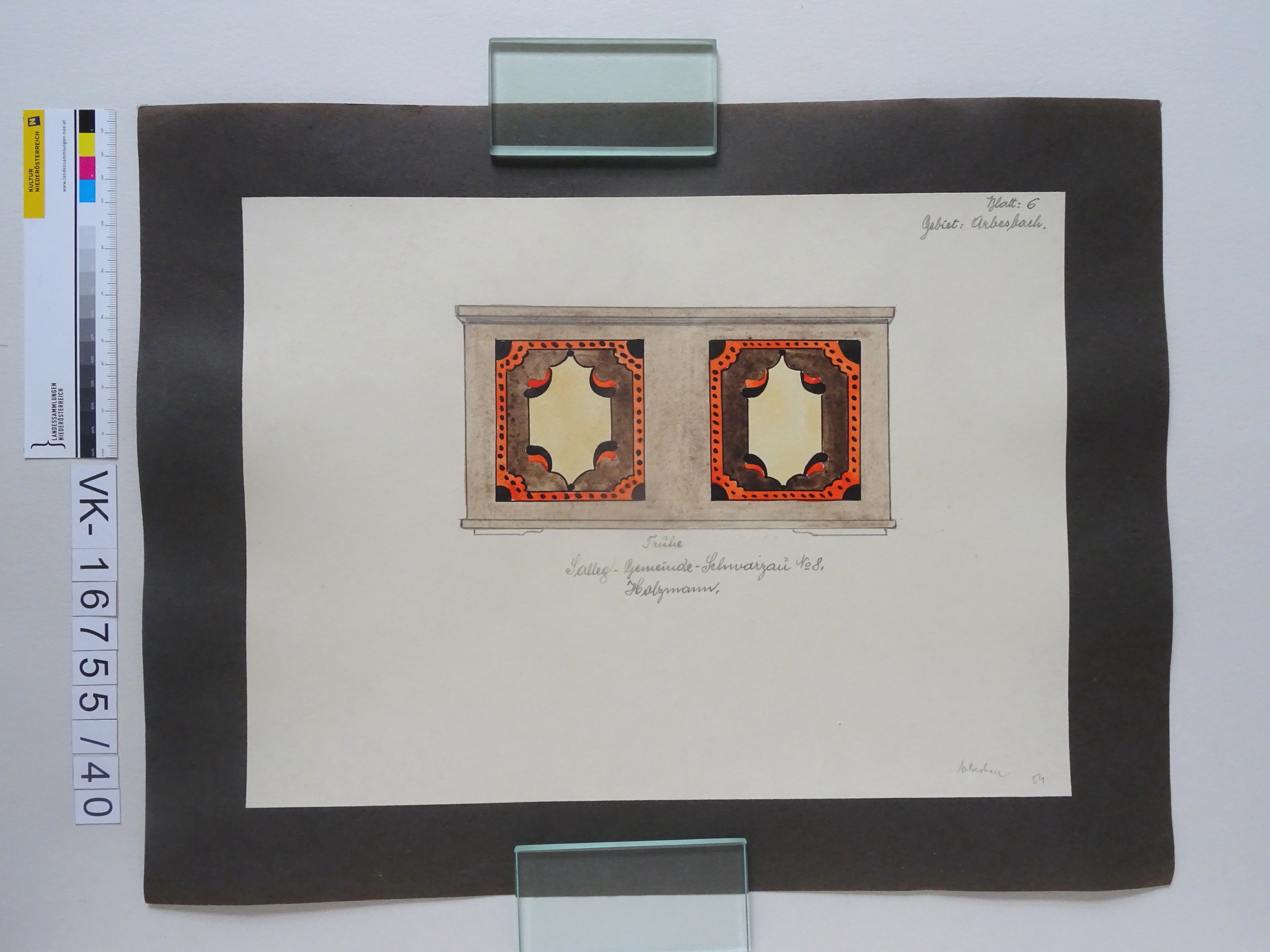 Zeichnung aus der Serie Waldviertler Heimatbilder: "Blatt 6: Gebiet Arbesbach, Salleg - Gemeinde-Schwarzau Nr. 8 "Holzmann", Truhe"; bemalte Truhe; kaschiert auf Karton; laut Liste von Hans Neumüller; 54, 45/4