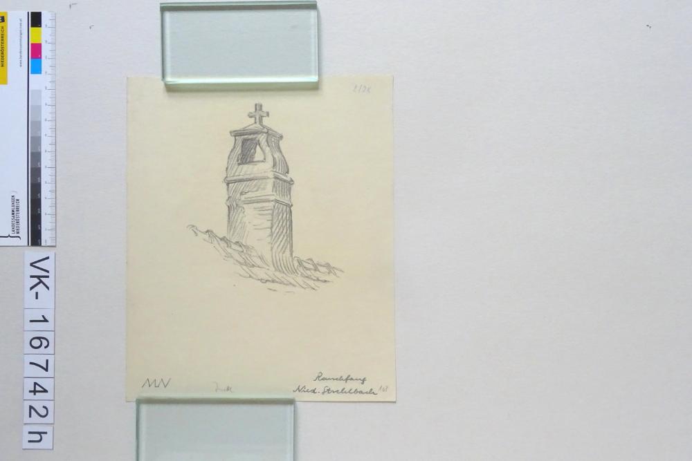 Zeichnung aus der Serie Waldviertler Heimatbilder: "Zwettl, Rauchfang Nieder-Strahlbach, MN"; mit Kreuz; signiert; 168, 2/28