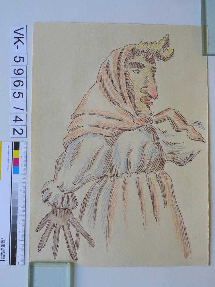 Zeichnung aus der Serie Waldviertler Heimatbilder: "Marionette: Hexe, von Waldviertler Bäuerin 1942 gefertigt, Kopf aus Papiermasse, bemalt; MN"; 13 Zeichnungen zusammengefasst mit einer Banderole: "13 von 100 Marionetten, welche 1942 von Waldviertler Bäuerinnen des Gebietes Zwettl für arme Kinder angefertigt wurden", signiert