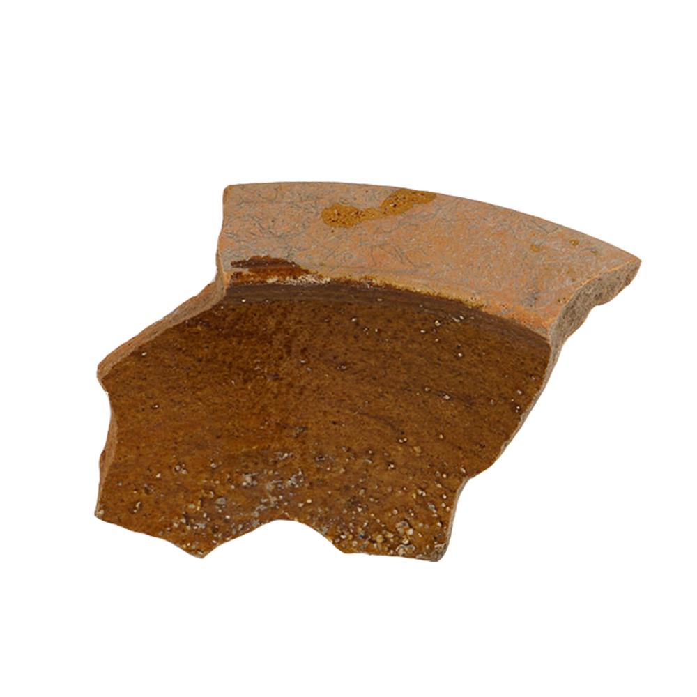 Randfragment einer Reibschüssel mit gestrecktem Kragenrand. Der Gefäßkörper wird durch eine stegartige nach innen geneigte dünne Lippe vom Kragenrand getrennt. Innenseite mit braungelb glasiertem Steinchenbewurf. An der Oberseite des Randes und an der Gefäßaußenseite Glasurspritzer. Oxidierend gebrannte Keramik.
