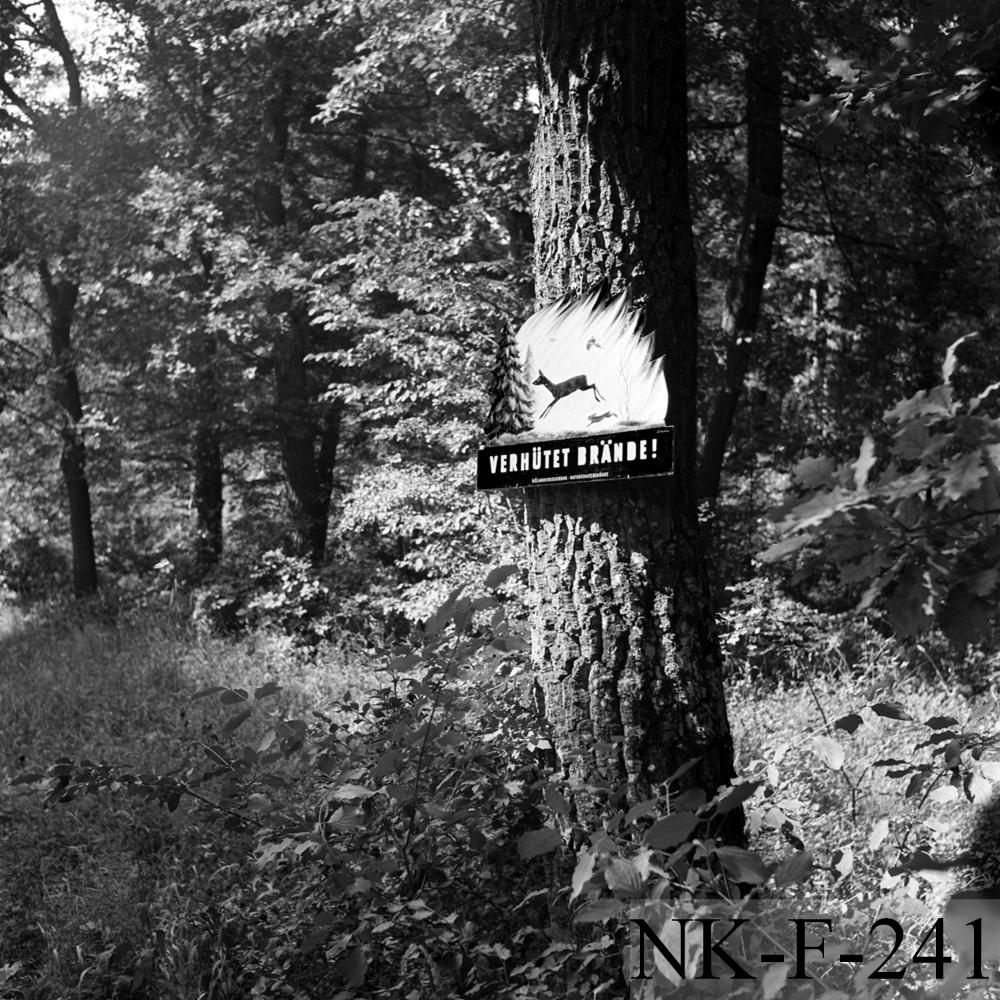 Naturschutzmarterl mit Motiv flüchtender Waldtiere: "Verhütet Brände!"