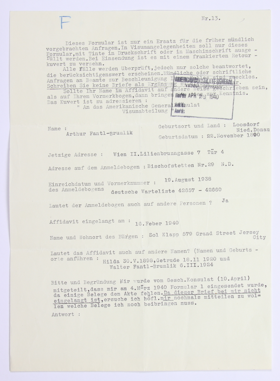 Im April 1940 glaubt die Familie Fantl-Brumlik noch an die Möglichkeit, in die USA auszuwandern. Das Affidavit von Sol Klapp wurde an die Familie übersendet. In Wirklichkeit liegt eine mögliche Auswanderung in weiter Ferne. Für die Einreise fehlen dem Amerikanischen Konsulat noch Dokumente. (vgl. Zeillinger, Der Gürtel des Walter Fantl, S.51ff.)