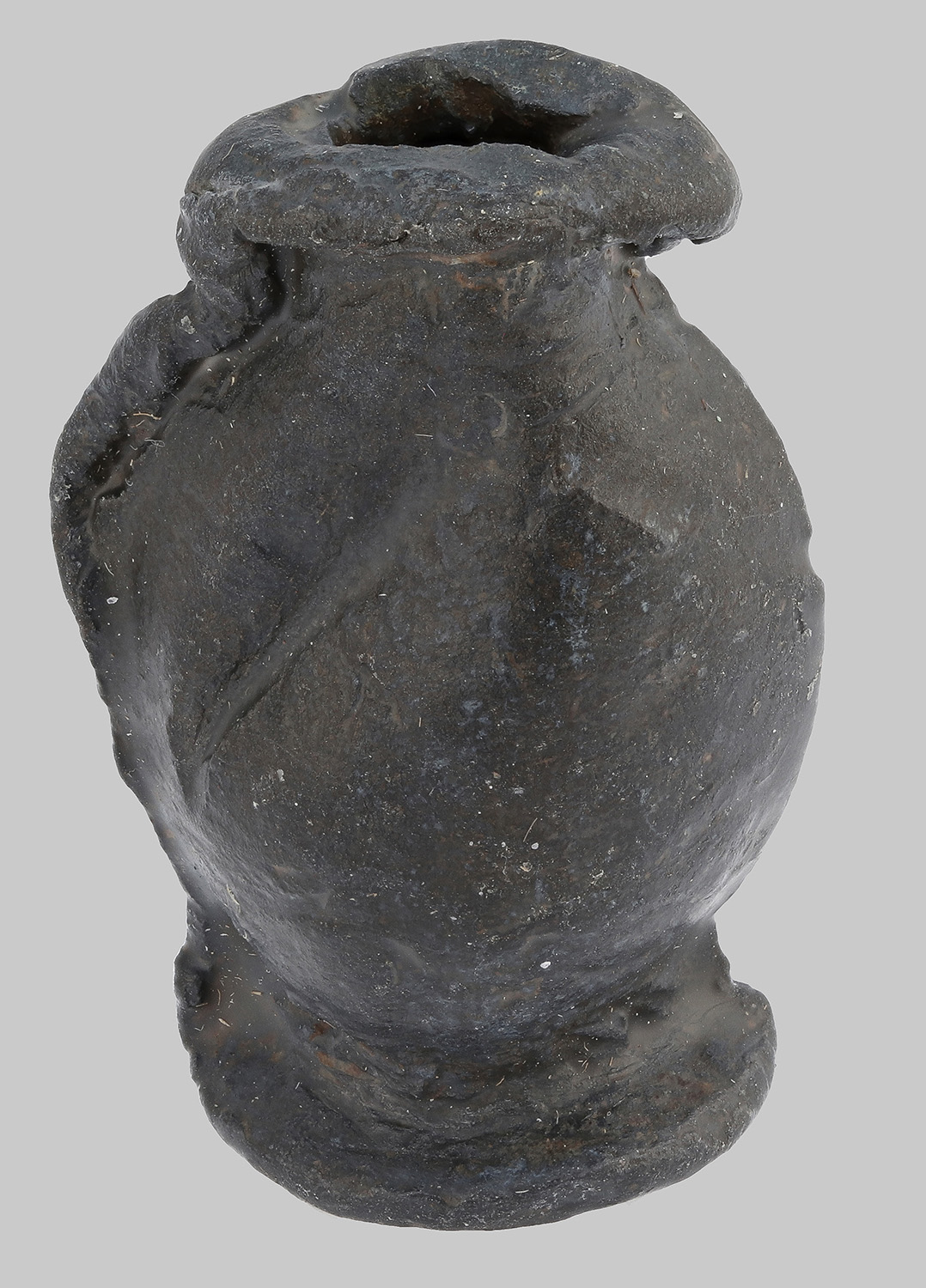 Votiv in Form eines Miniaturkruges; bauchiger Körper, breiter Standring, kurzer Hals und ausladender Rand mit Schnabelausguss; hinten sehr breite eingedrückte Gussnaht, wahrscheinlich Henkel; eine Hälfte des Standrings nicht ausgegossen