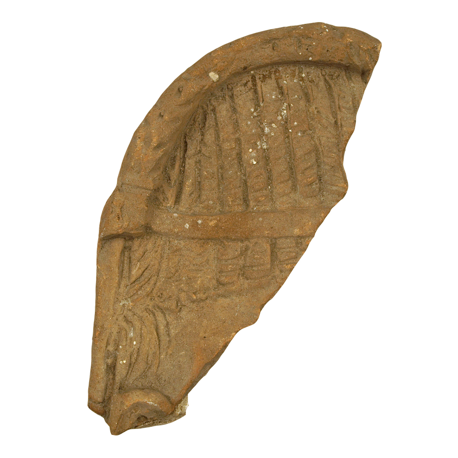 Bruchstückhaft erhaltener Stirnziegel (Antefix), welcher die Darstellung einer Maske zeigt. Das geflochtene Haar wird durch ein Band zusammengehalten. Zu erkennen sind darüber hinaus Reste einer Augenbraue sowie eines Ohrs.