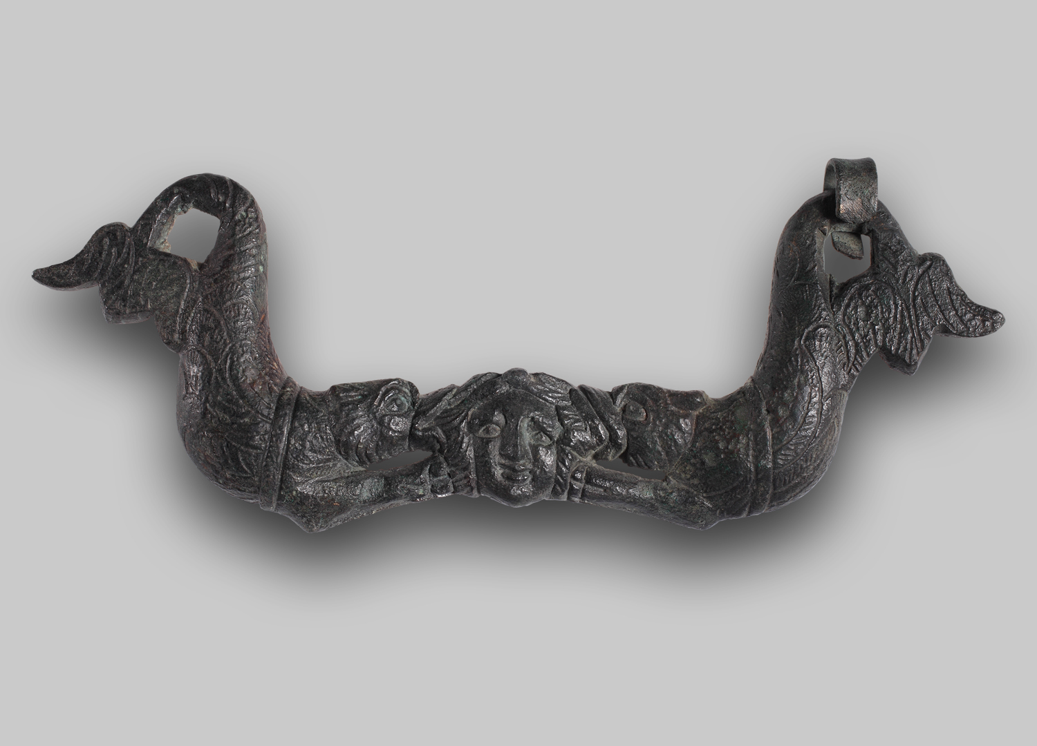 Den Griff bilden zwei antithetisch um einen Medusenkopf angeordnete Delphine.