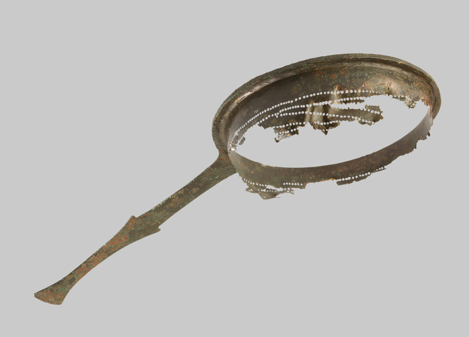 Sieb mit langem flachem Griff. Ruderschlegelförmiges Griffende. Der ausgebrochene Siebboden ist fragmentiert erhalten, jedoch am Foto nicht abgebildet.