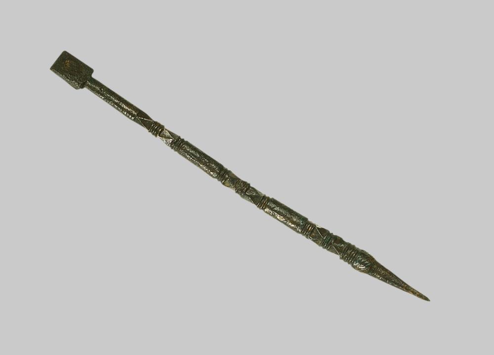 Im Querschnitt runder Stiel, mit facettierten Bändern und Rillen verziert. Rechteckige Glättfläche. Kurze Spitze.