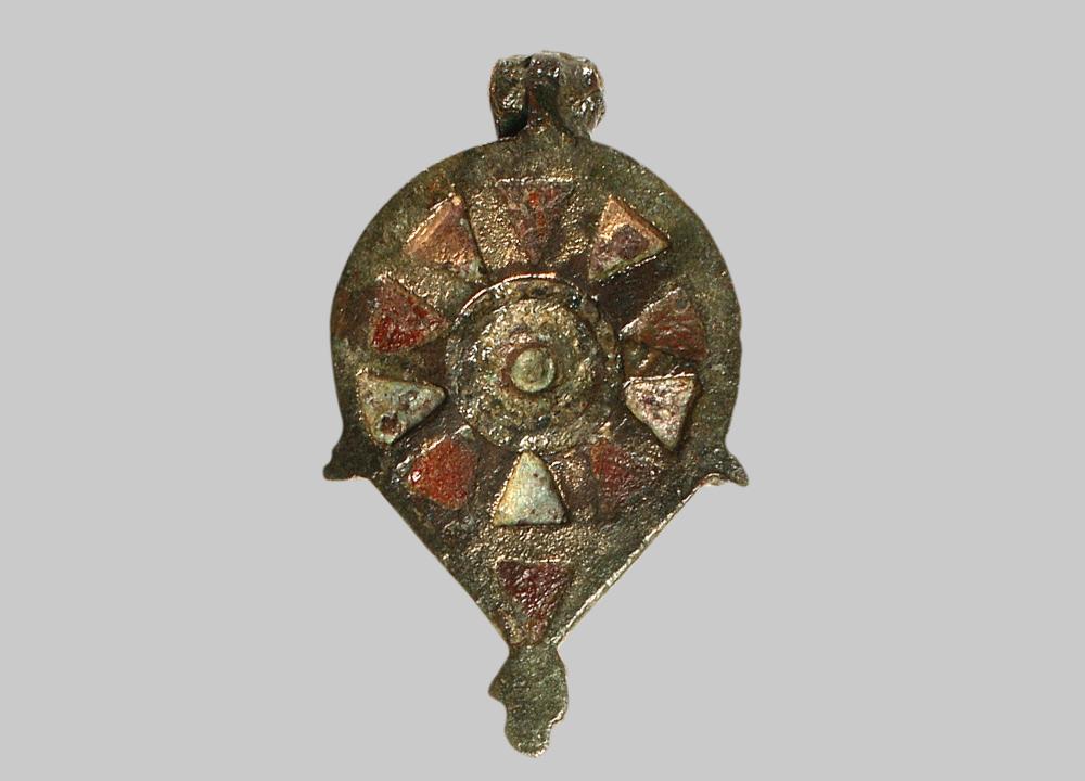 Eine blattförmige Siegelkapsel mit Backenscharnier. Der Deckel ist mittels eines Kreissteges in zwei konzentrische Felder unterteilt. Die Randzone ist durch zehn Bronzedreiecke gegliedert, wobei die so geformten Dreiecke abwechselnd mit rotem und wahrscheinlich blauem Email eingelegt sind. Im Zentrum des Deckels befindet sich ein vertieftes Loch. Rundum verläuft ein Kreissteg, der vermutlich mit blauem Email ausgelegt war. Die Dose weist U-förmige seitliche Einschnitte auf (einer davon ist nur angedeutet) und drei Durchbrechungen im Boden.