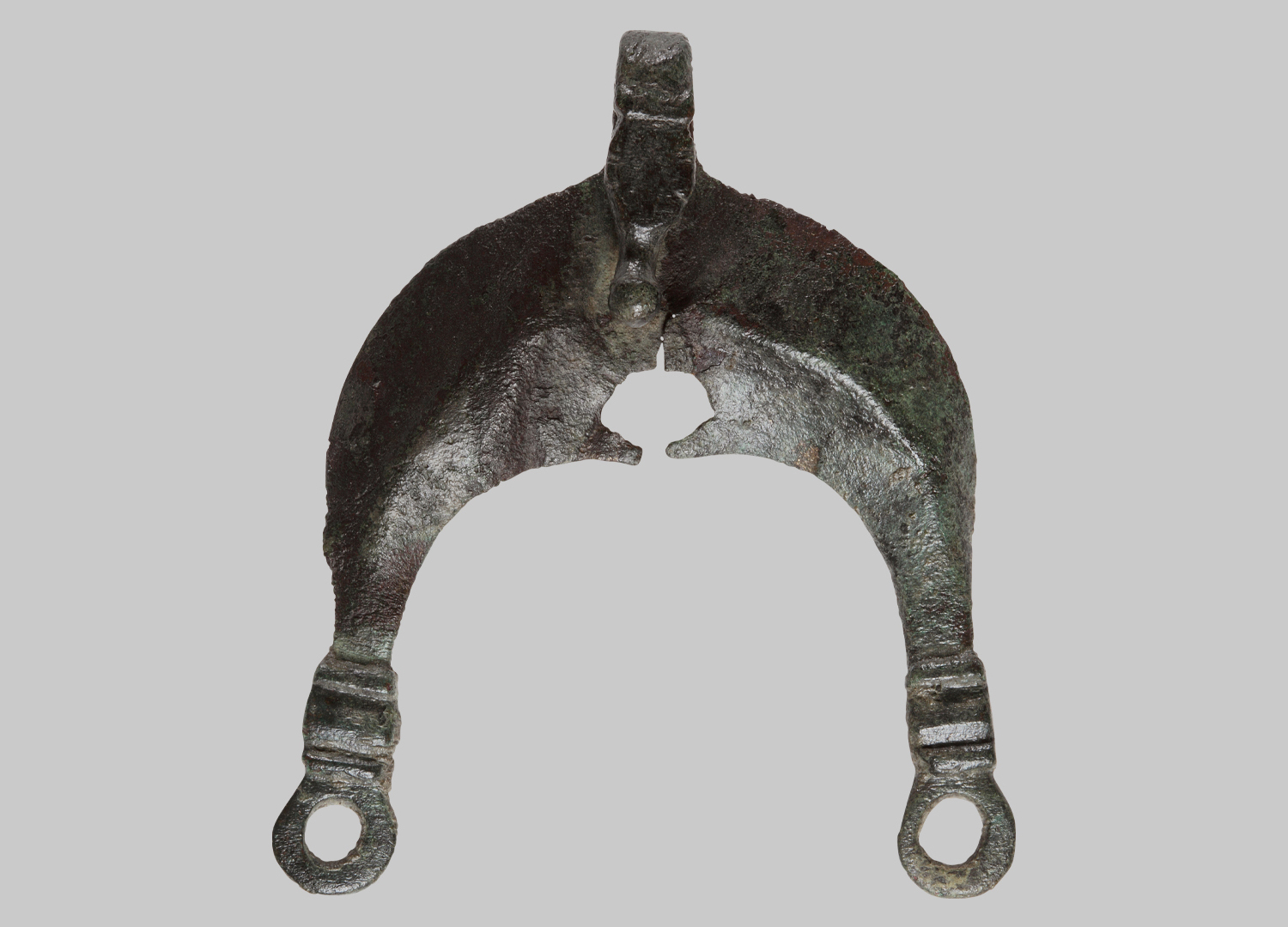 Anhänger in Lunulaform mit profilierten, ösenförmig ausgebildeten Enden und Mittelgrat. Den oberen Abschluss bildet ein umgebogenes Aufhängeblech. Das eingestanzte Loch im Scheitelpunkt der Sichel diente ursprünglich zur Aufhängung eines zusätzlichen Anhängers, der verloren gegangen ist.