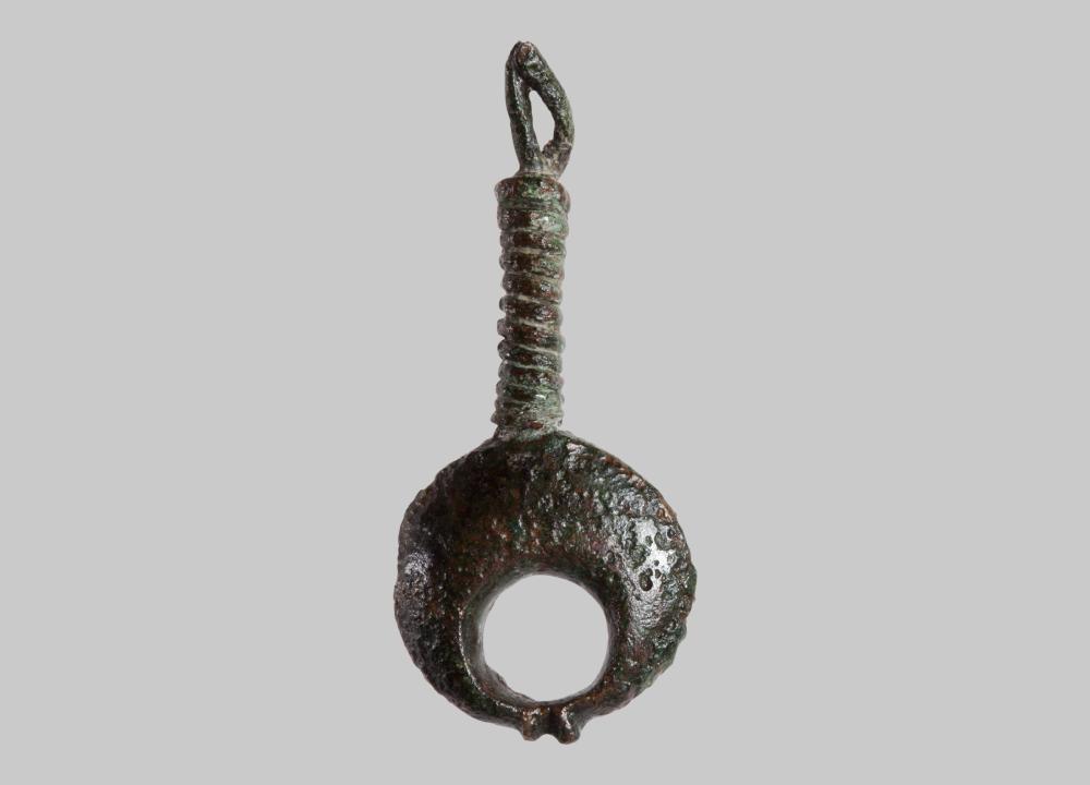 Kleiner lunulaförmiger Anhänger mit scheibenförmigen, geschlossenen Enden. Ein senkrechtes Metallstück, das von einem dünnen Bronzedraht umwickelt ist, bildet die Verbindung zur Öse.