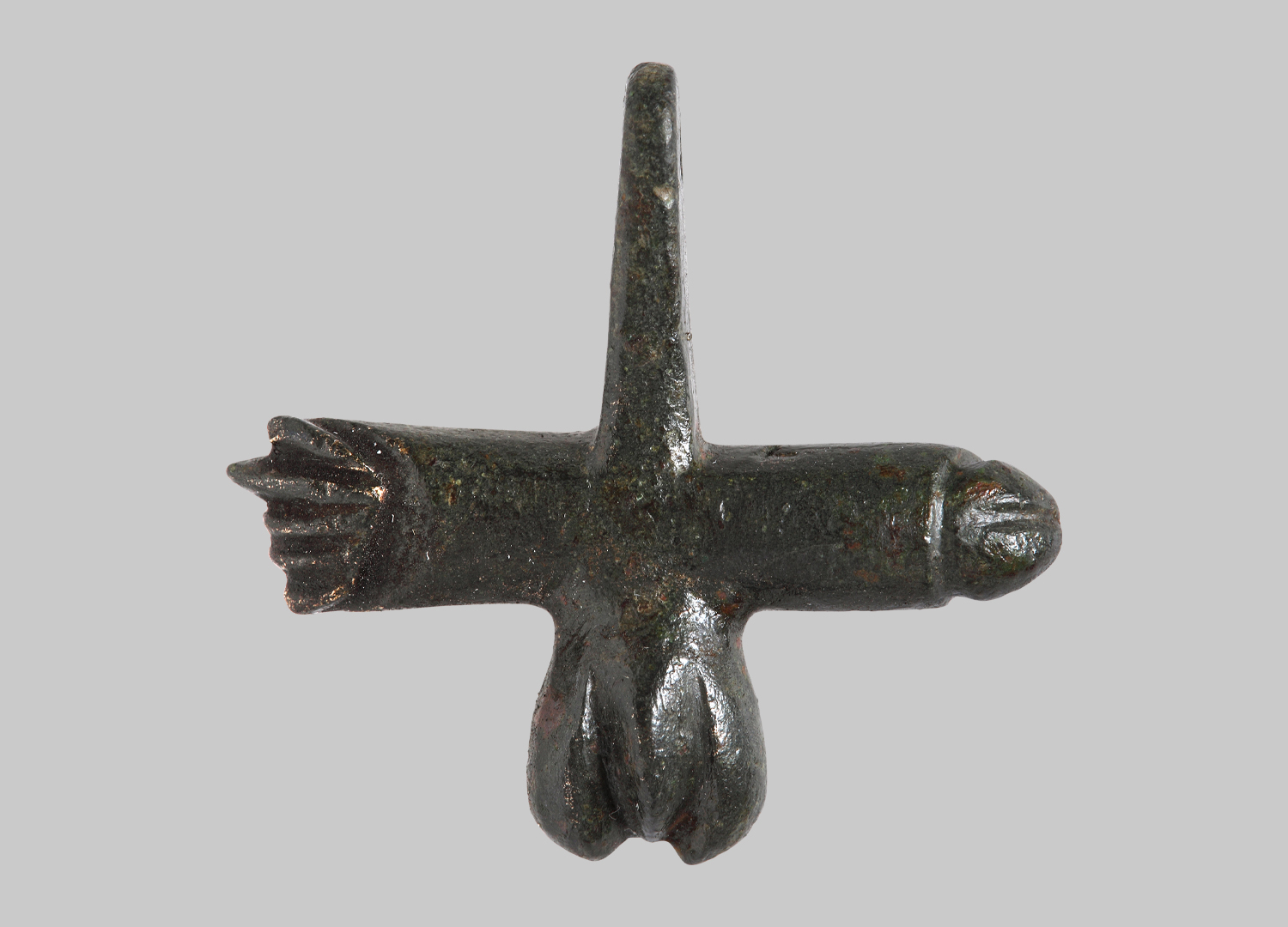 Das Amulett mit quergestellter Aufhängeöse hat die Form eines Querbalkens, dessen rechtes Ende als Phallus und dessen linkes Ende als Hand mit der Fingergeste der "Feige" gestaltet ist. Am unteren Rand des Balkens erkennt man mittig die Andeutung der männlichen Geschlechtsorgane.