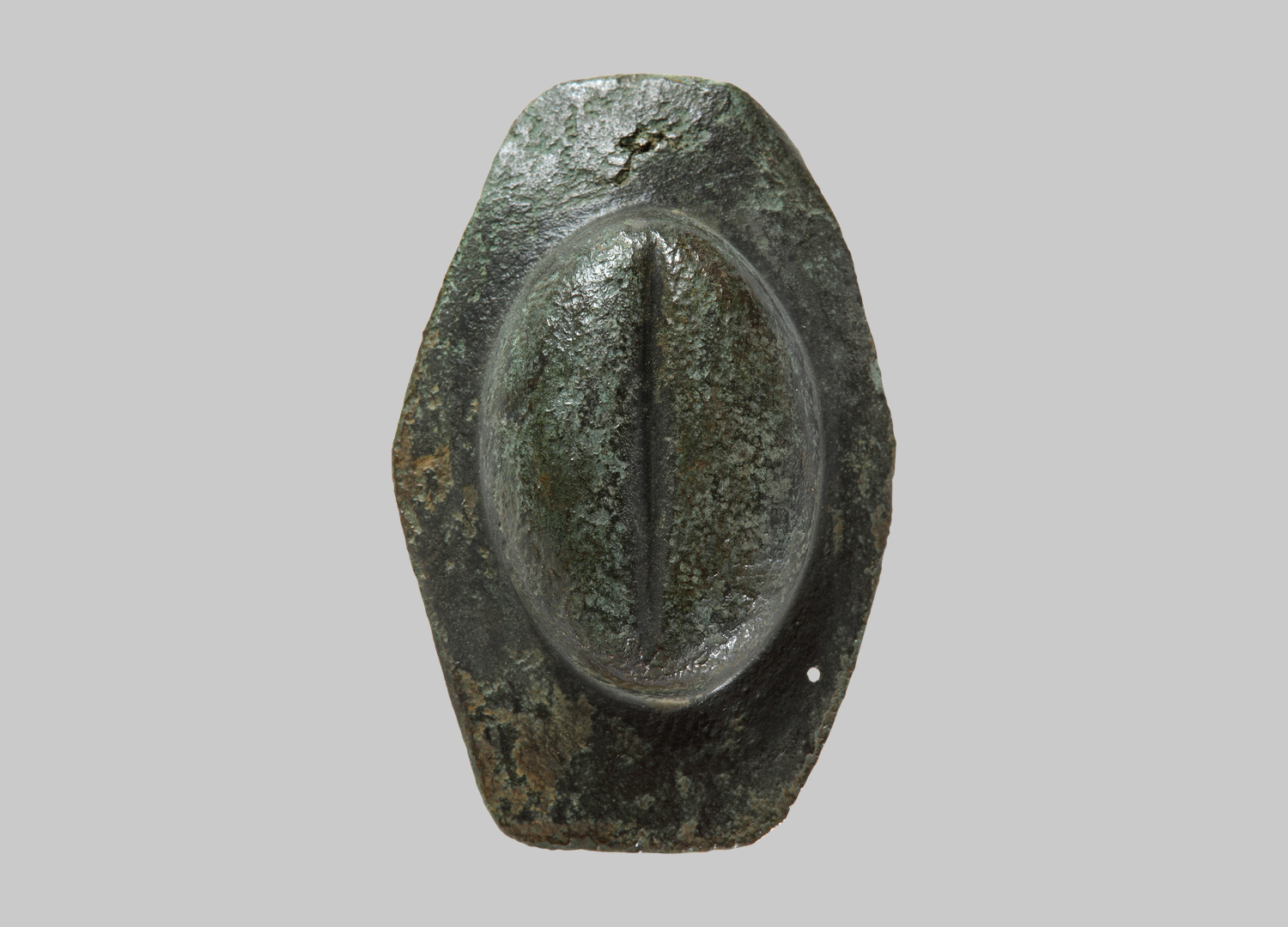 Der Beschlag besteht aus einer sechseckigen Grundplatte mit aufgesetztem Dekorelement, das als Vulva gestaltet wurde. Auf der Rückseite sind noch beide Stiftknöpfe erhalten.
