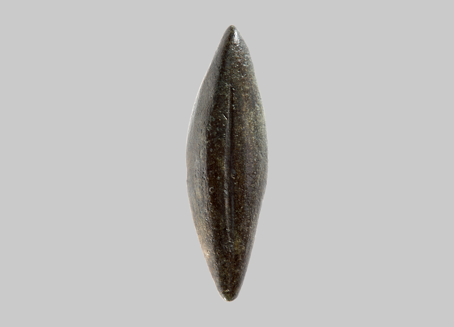 Die spitz-ovale Grundplatte ist konvex gewölbt und weist eine mittige Einkerbung auf der Vorderseite auf. Auf der Rückseite befindet sich ein großer Stiftknopf.