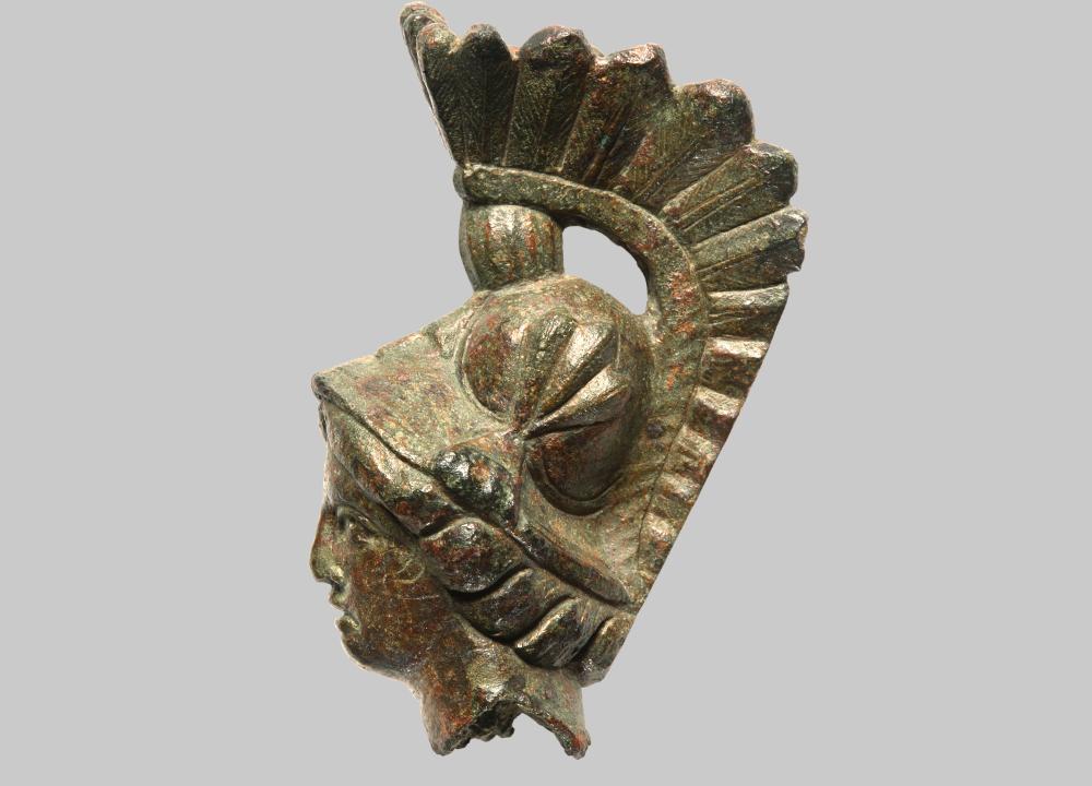 Kopf einer Statuette oder einer Büste. Minerva trägt einen korinthischen Helm mit seitlichen Palmettenreliefs. Ein überdimensionaler Helmbusch reicht bis an den unteren Rand des Nackenschutzes. Unter dem Helm quillt das vom Mittelscheitel aus in lockeren Wellenpartien zurückgekämmte Haar hervor.