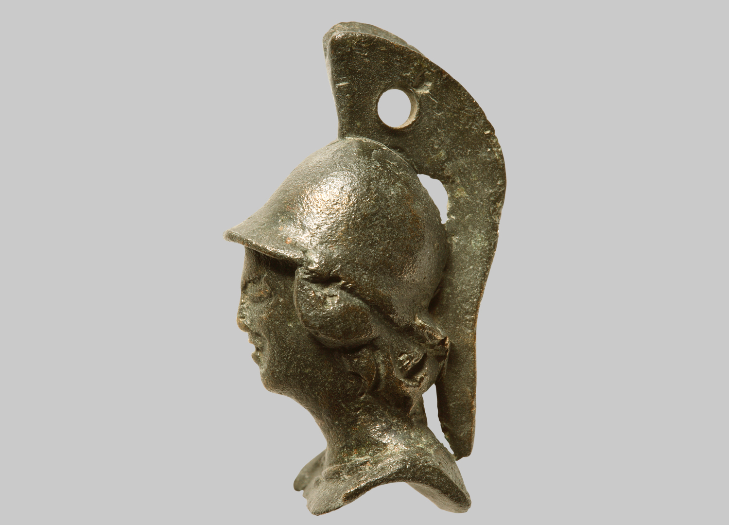 Die kleine Büste der Minerva ist im Detail kaum ausgearbeitet. Helm, Helmbusch und Haare sind glatt belassen. Im Helmbusch erkennt man ein kreisrundes Loch. Applike.
