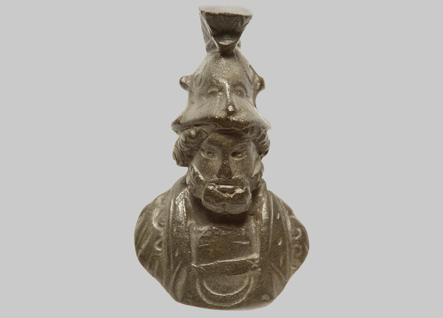 Unregelmäßig ausgeschnittene Büste des Mars. Er trägt einen Panzer, der am Hals viereckig gerahmt ist. Auf der Brust eine Verzierung in Form einer mit den Spitzen nach oben gerichteten Mondsichel. An den Schultern die angedeuteten Lederlaschen. Auf dem Kopf ein korinthischer Helm mit Nasen- und Augenangabe und Helmbusch. Der bärtige Kopf wird von einem gelockten Haarkranz gerahmt. Flache Rückseite mit einer runden Vertiefung zur Befestigung.