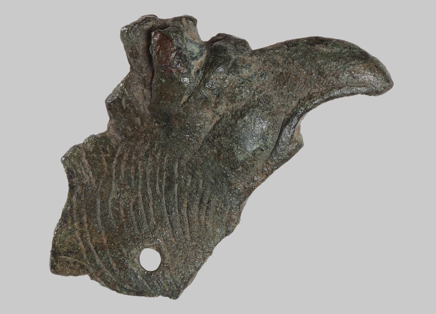 Der Griff ist in Form eines Greifenkopfes gestaltet. Die Federn sind durch Gravur angedeutet. Der gezackte Kamm ist nur mehr im Ansatz erhalten. Der geschlitzte untere Rand des Griffs zur Aufnahme des Eisenblattes der Klinge ist nur mehr zum Teil erhalten. Man erkennt ein Nietloch.