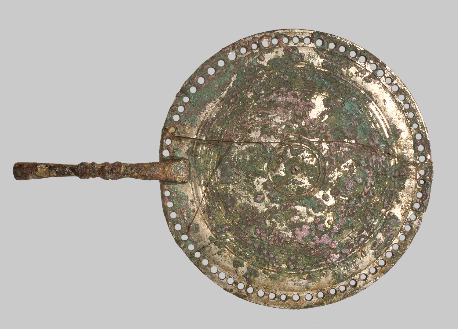 Versilberter Spiegel mit Lochrand und gedrehten Reliefringen. Profilierter Griff nicht dazugehörig, da kein Spiegelgriff.