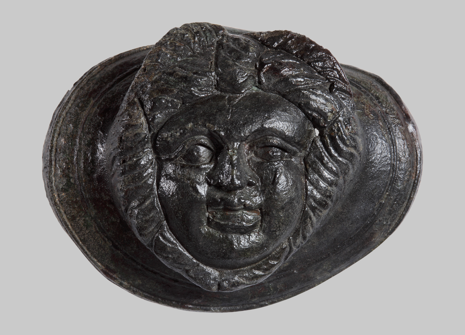 Die etwas deformierte Scheibe weist einen breiten flachen Rand auf, der mit konzentrischen Kreisrillen verziert ist. Mittig tritt ein Medusenhaupt plastisch hervor. Das Gesicht wird vom seitlich mähnenartig verlaufenden Haar umrahmt. Auf dem Kopf erkennt man ein Flügelpaar. Unter dem Kinn der angedeutete Schlangenknoten. In den ungleich gestalteten Augen sind die Pupillen mittels kleiner runder Bohrung angedeutet, darüber liegt ein wulstiges Oberlid. Die Nase weist breite Nasenflügel auf. Der Mund ist leicht geöffnet dargestellt.
