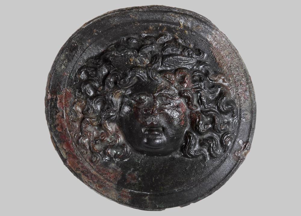 Die kreisrunde Scheibe hat einen schmalen flachen Rand, der mit konzentrischen Kreisrillen verziert ist und im oberen Abschnitt etwas deformiert ist. Im Zentrum befindet sich ein Bildfeld mit glattem Hintergrund und einem reliefartig hervortretenden Medusenhaupt in Vorderansicht. Das runde Gesicht weist große, viel zu eng zueinander stehende Augen auf, deren Pupillen durch runde Bohrungen hervorgehoben sind. Man erkennt eine schmale Nase mit breiten Nasenflügeln. Der Mund ist leicht geöffnet. Wirr angeordnete gelockte Haarsträhnen umrahmen das pausbäckige Gesicht oben und seitlich. Über der Stirn sitzt im Haar ein Flügelpaar. Auf der Rückseite sind noch die Reste eines mittig angebrachten Befestigungsstiftes sichttbar.