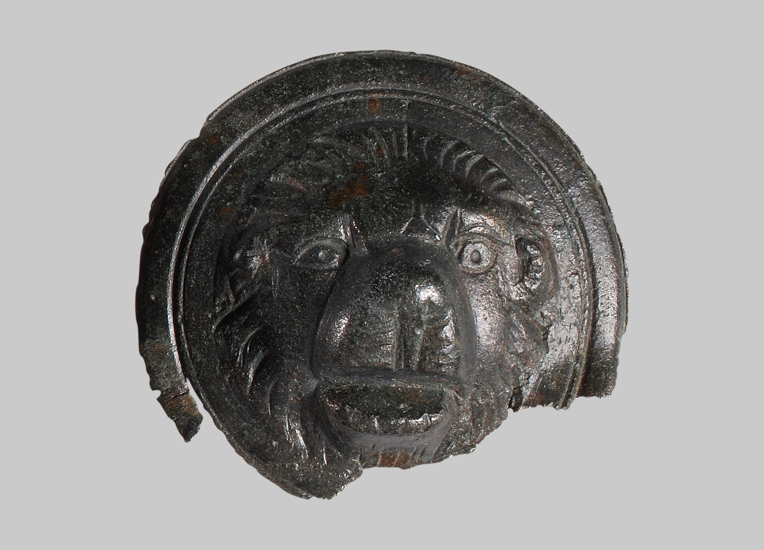 Die leicht gewölbte Scheibe hat einen gerillten Rand. In der Mitte erhebt sich ein leicht plastisch hervortretender Kopf eines Löwen. Die Pupillen in den Augen sind durch kleine runde Bohrungen hervorgehoben. Das Maul unter der wuchtigen Schnauze ist leicht geöffnet. In der unteren Hälfte sind fast der komplette Rand sowie geringe Teile der Löwenmähne weggebrochen. Auf der Rückseite erkennt man einen Befestigungsknopf am oberen Rand.