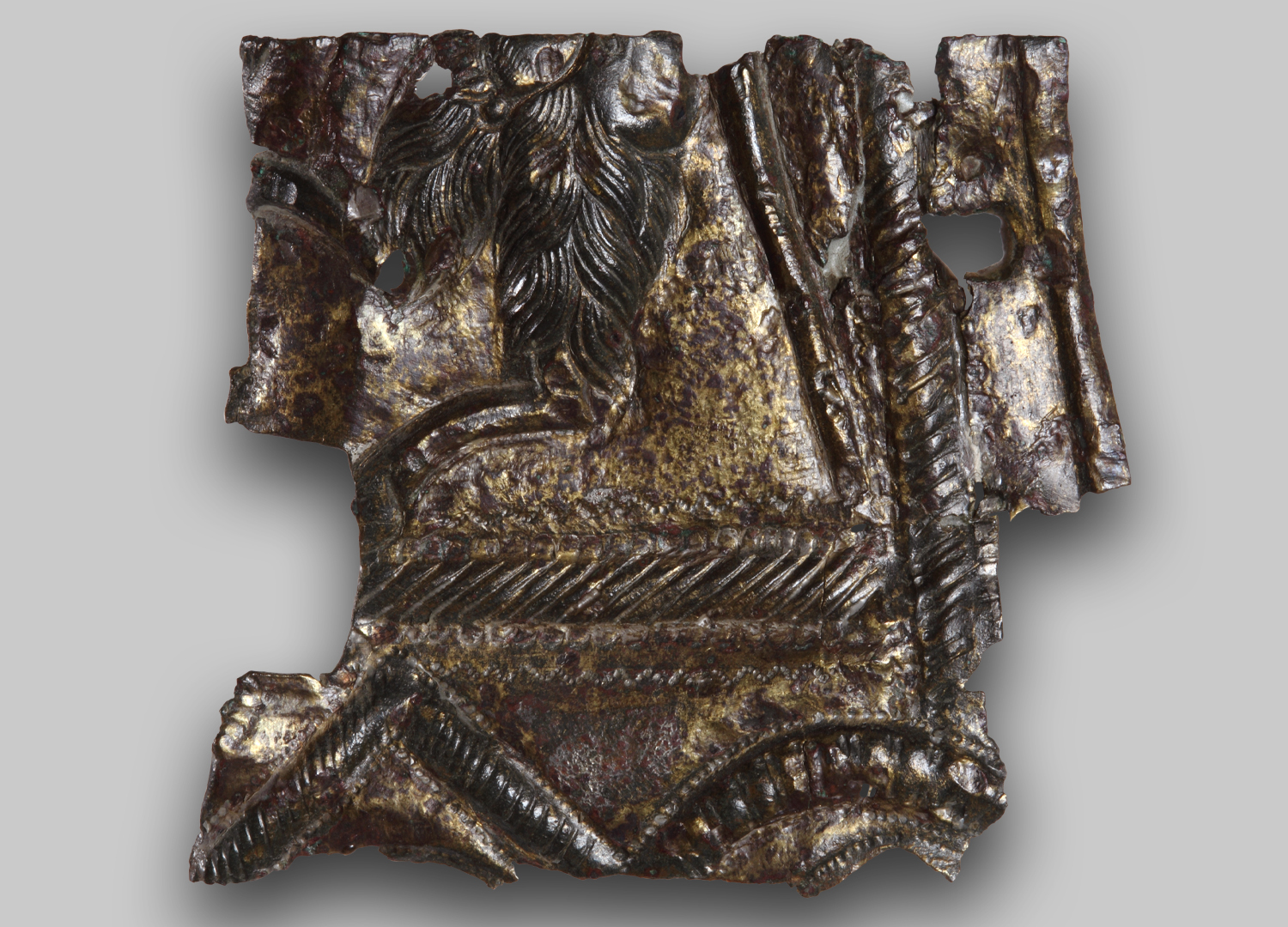 Das Fragment zeigt den bocksfüßigen Pan mit Hirtenstock. Darunter erkennt man einen Dreiecksrahmen und den Teil eines Rundbogens.